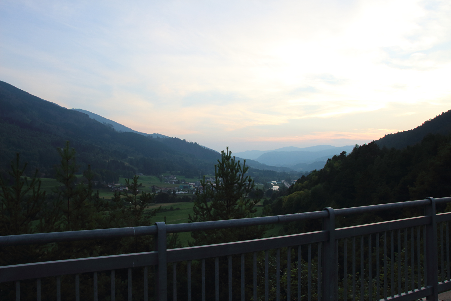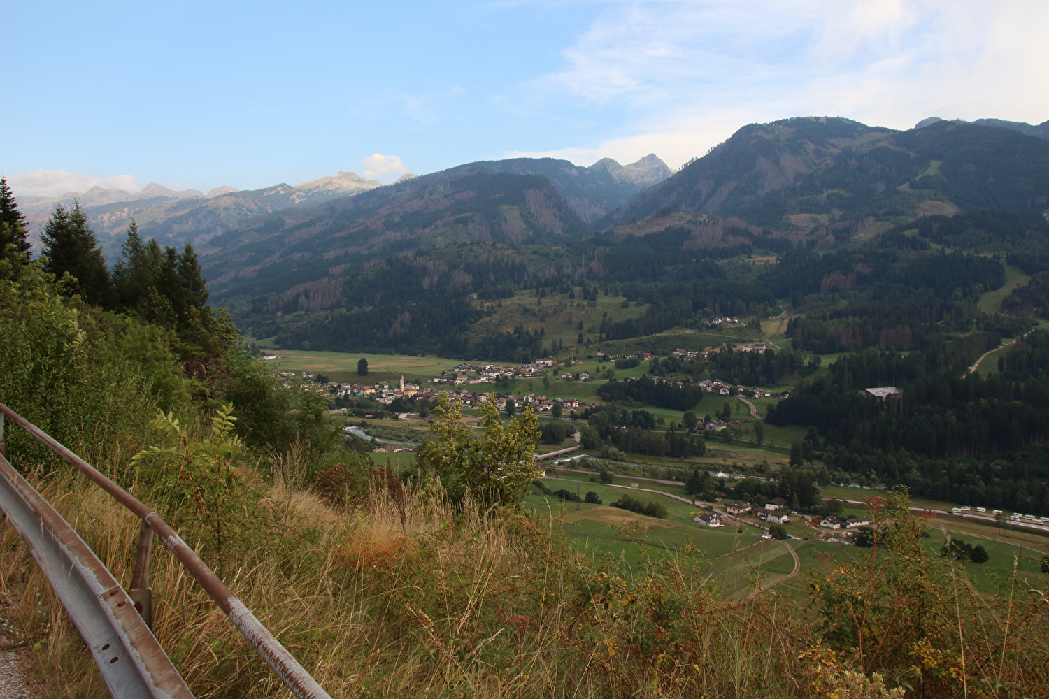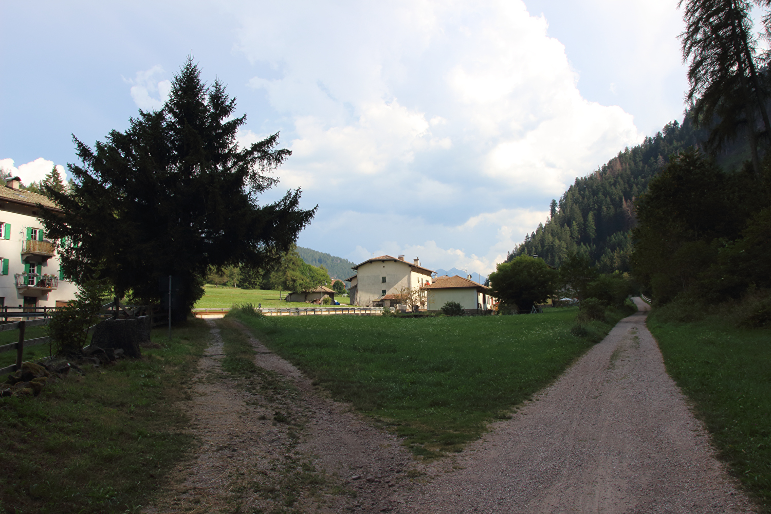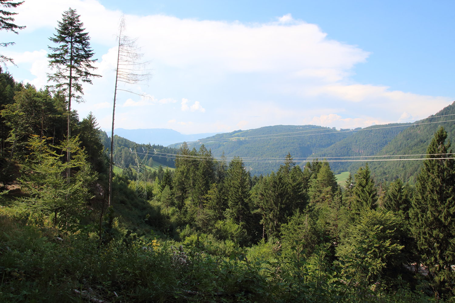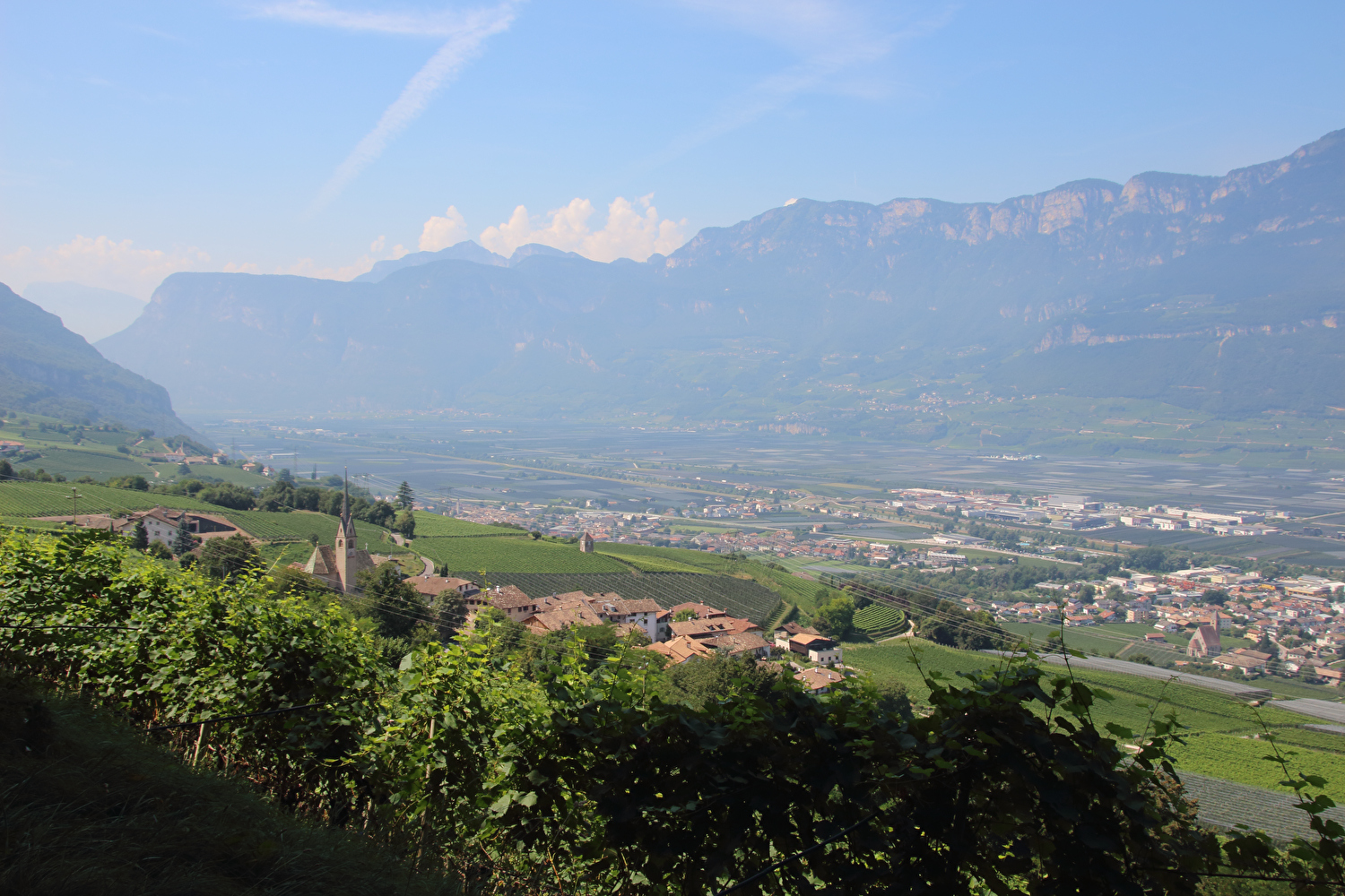 Wegen des sonnig-schwülheißen Wetters fiel die Wahl auf den Fleimstalbahn-Radweg. Die Luft war schon am Morgen zum Schneiden. Da musste nicht auch noch eine Wolke aus Autoabgasen und Feinstaub bergauf durchgezogen werden. Anders als auf dem Etsch-Radweg am Vortag hielt sich der Fahrradverkehr auf dem Fleimstalbahn-Radweg in überschaubaren Grenzen. Oberhalb des 2. Tunnels erfolgte eine baustellenbedingte Umleitung auf einem sehr steilen Weg nach Kalditsch, womit nach der kurzen steilen Rampe zwischen SS12 und ehemaliger Bahntrasse und der Ortsdurchfahrt Pinzon die dritte Schiebestrecke anstand. Von Kalditsch aus boten sich die letzten weiten Blicke ins Etschtal. Etwa ab Kalditsch besserte sich auch allmählich die Luftqualität, schwülwarm blieb es aber bis zum Etappenende. Nach reichlich mittelgebirgiger Landschaft zeigten sich mit dem Blick über San-Lugano auch wieder alpine Landschaften am Horizont. In San Lugano wurde für den Rest der Etappe auf die im Hang verlaufende SS48 gewechselt. Ein Wechsel auf den knapp südlich von San Lugano ausgeschildeten Radweg „pista ciclabile val di Fiemme-Fassa“ hätte zusätzliche Streckenkilometer und vor allem zusätzliche Höhenmeter bergauf gebracht, was im Rahmen dieser Etappe entbehrlich war. Zudem hätte der Wechsel eine Fahrt auf dem Talboden des Val di Fiemme bedeutet, wo es zum Abend hin schneller dunkel wurde und sich auch keine so weiten Blicke über das Tal wie von der SS48 aus geboten hätten. Knapp südlich von San-Lugano wurde die Grenze zwischen den Provinzen Südtirol (amtlich: „Autonome Provinz Bozen – Südtirol | Provincia Autonoma di Bolzano – Alto Adige“) und Trentino (amtlich: „Provincia autonoma di Trento“) und damit einhergehend auch die Sprachgrenze zwischen „bilingual deutsch & italienisch“ und „italienisch“ überquert. Zum späteren Nachmittag und Abend hin bildeten sich auch höhere Quellwolken, von denen einige nach Regen aussahen, aber es blieb bis zum Ende der Etappe trocken. Von der SS48 aus reichte der Blick bis zur Gruppo delle Pale in den Dolomiten, die kurz vor Etappenende Alpenglühen zeigte.