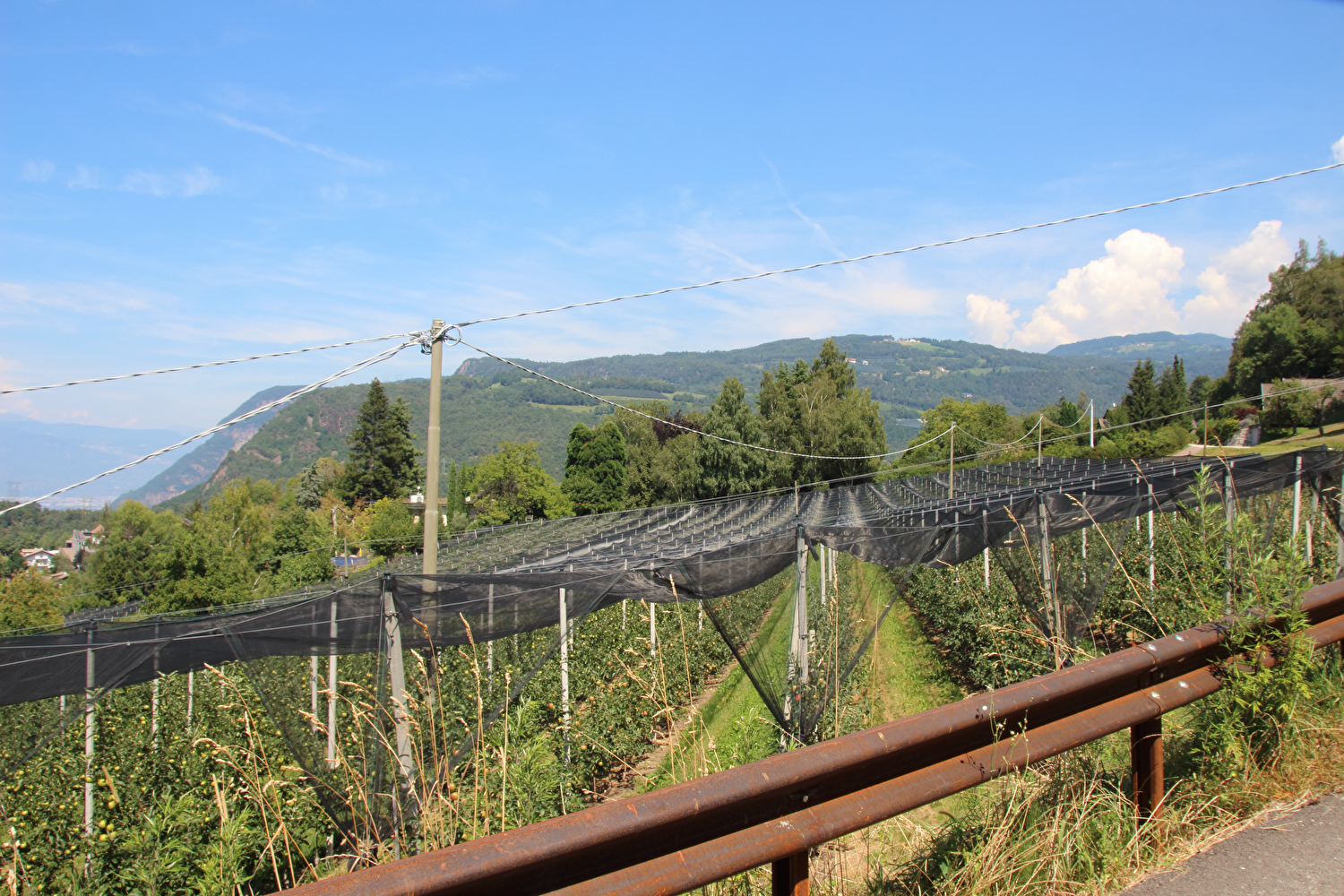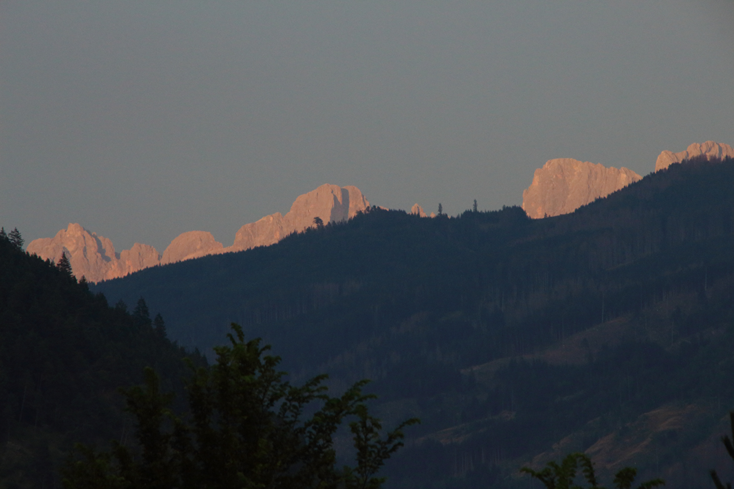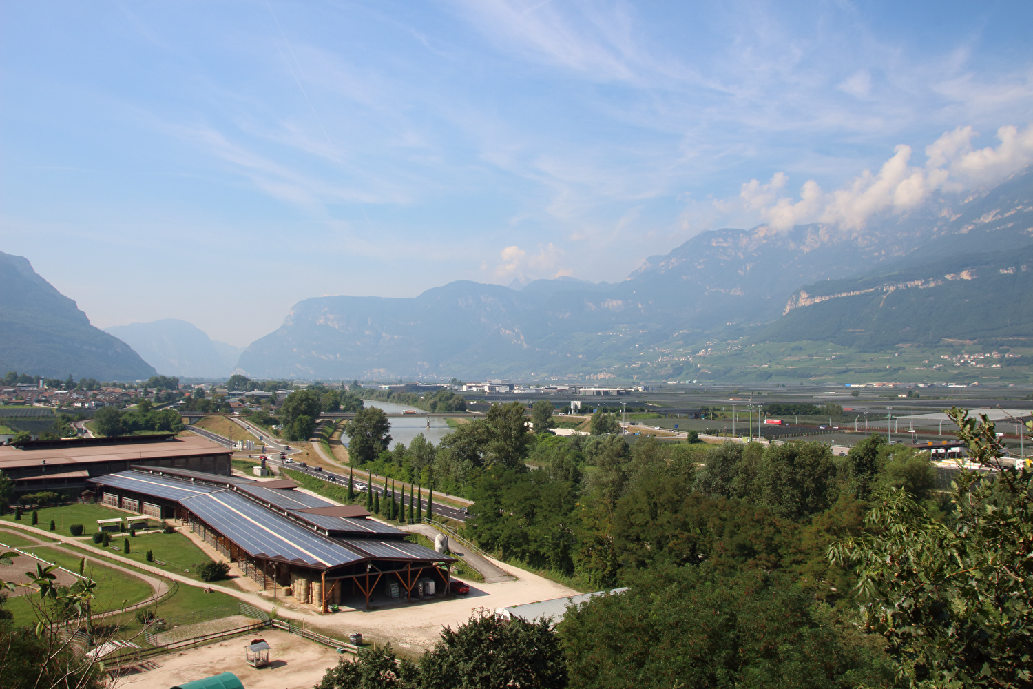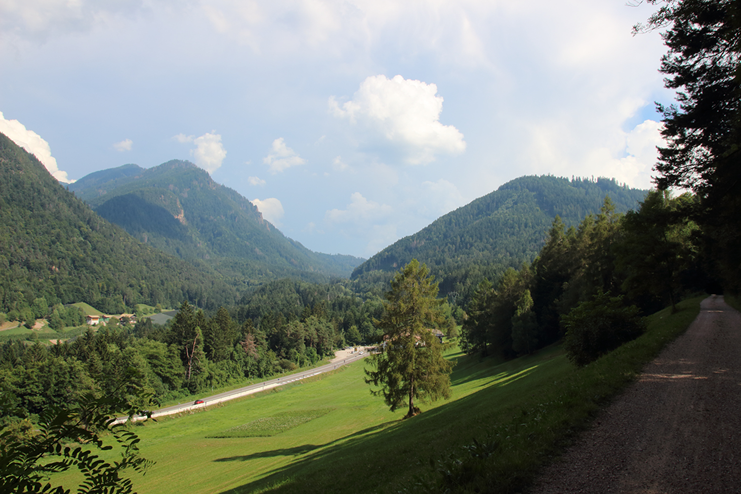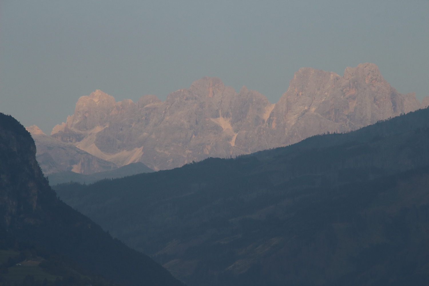 Wegen des sonnig-schwülheißen Wetters fiel die Wahl auf den Fleimstalbahn-Radweg. Die Luft war schon am Morgen zum Schneiden. Da musste nicht auch noch eine Wolke aus Autoabgasen und Feinstaub bergauf durchgezogen werden. Anders als auf dem Etsch-Radweg am Vortag hielt sich der Fahrradverkehr auf dem Fleimstalbahn-Radweg in überschaubaren Grenzen. Oberhalb des 2. Tunnels erfolgte eine baustellenbedingte Umleitung auf einem sehr steilen Weg nach Kalditsch, womit nach der kurzen steilen Rampe zwischen SS12 und ehemaliger Bahntrasse und der Ortsdurchfahrt Pinzon die dritte Schiebestrecke anstand. Von Kalditsch aus boten sich die letzten weiten Blicke ins Etschtal. Etwa ab Kalditsch besserte sich auch allmählich die Luftqualität, schwülwarm blieb es aber bis zum Etappenende. Nach reichlich mittelgebirgiger Landschaft zeigten sich mit dem Blick über San-Lugano auch wieder alpine Landschaften am Horizont. In San Lugano wurde für den Rest der Etappe auf die im Hang verlaufende SS48 gewechselt. Ein Wechsel auf den knapp südlich von San Lugano ausgeschildeten Radweg „pista ciclabile val di Fiemme-Fassa“ hätte zusätzliche Streckenkilometer und vor allem zusätzliche Höhenmeter bergauf gebracht, was im Rahmen dieser Etappe entbehrlich war. Zudem hätte der Wechsel eine Fahrt auf dem Talboden des Val di Fiemme bedeutet, wo es zum Abend hin schneller dunkel wurde und sich auch keine so weiten Blicke über das Tal wie von der SS48 aus geboten hätten. Knapp südlich von San-Lugano wurde die Grenze zwischen den Provinzen Südtirol (amtlich: „Autonome Provinz Bozen – Südtirol | Provincia Autonoma di Bolzano – Alto Adige“) und Trentino (amtlich: „Provincia autonoma di Trento“) und damit einhergehend auch die Sprachgrenze zwischen „bilingual deutsch & italienisch“ und „italienisch“ überquert. Zum späteren Nachmittag und Abend hin bildeten sich auch höhere Quellwolken, von denen einige nach Regen aussahen, aber es blieb bis zum Ende der Etappe trocken. Von der SS48 aus reichte der Blick bis zur Gruppo delle Pale in den Dolomiten, die kurz vor Etappenende Alpenglühen zeigte.