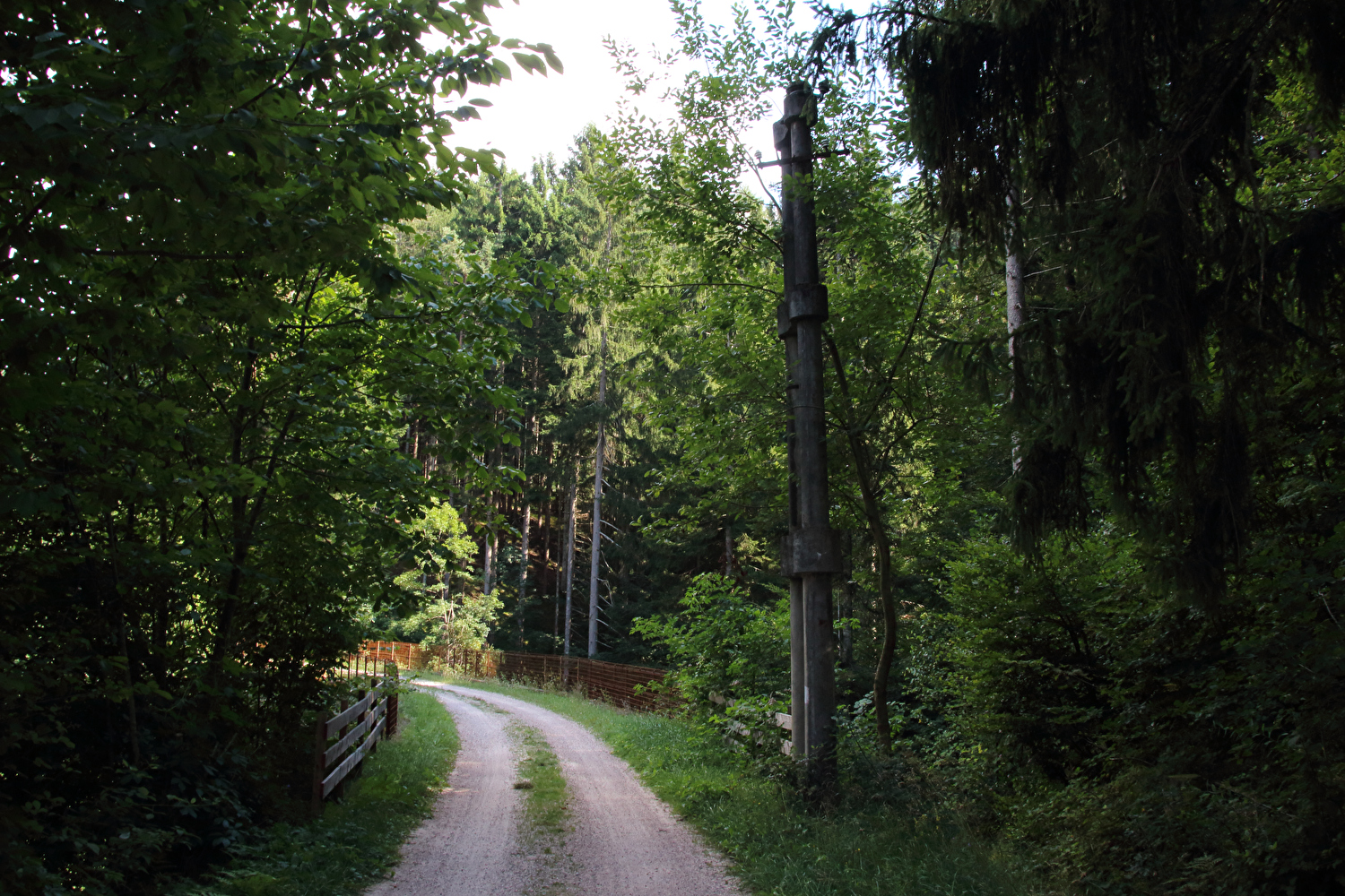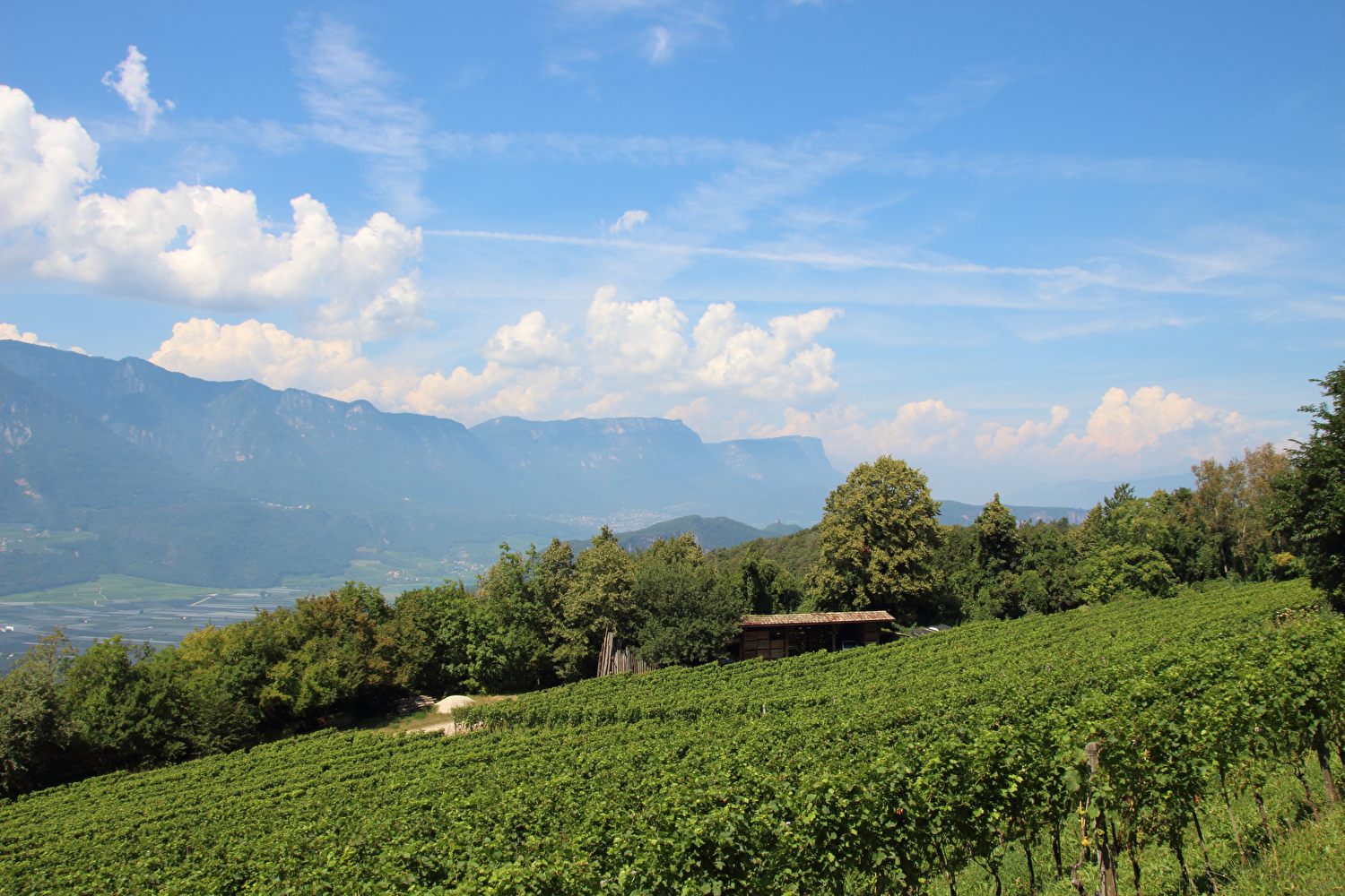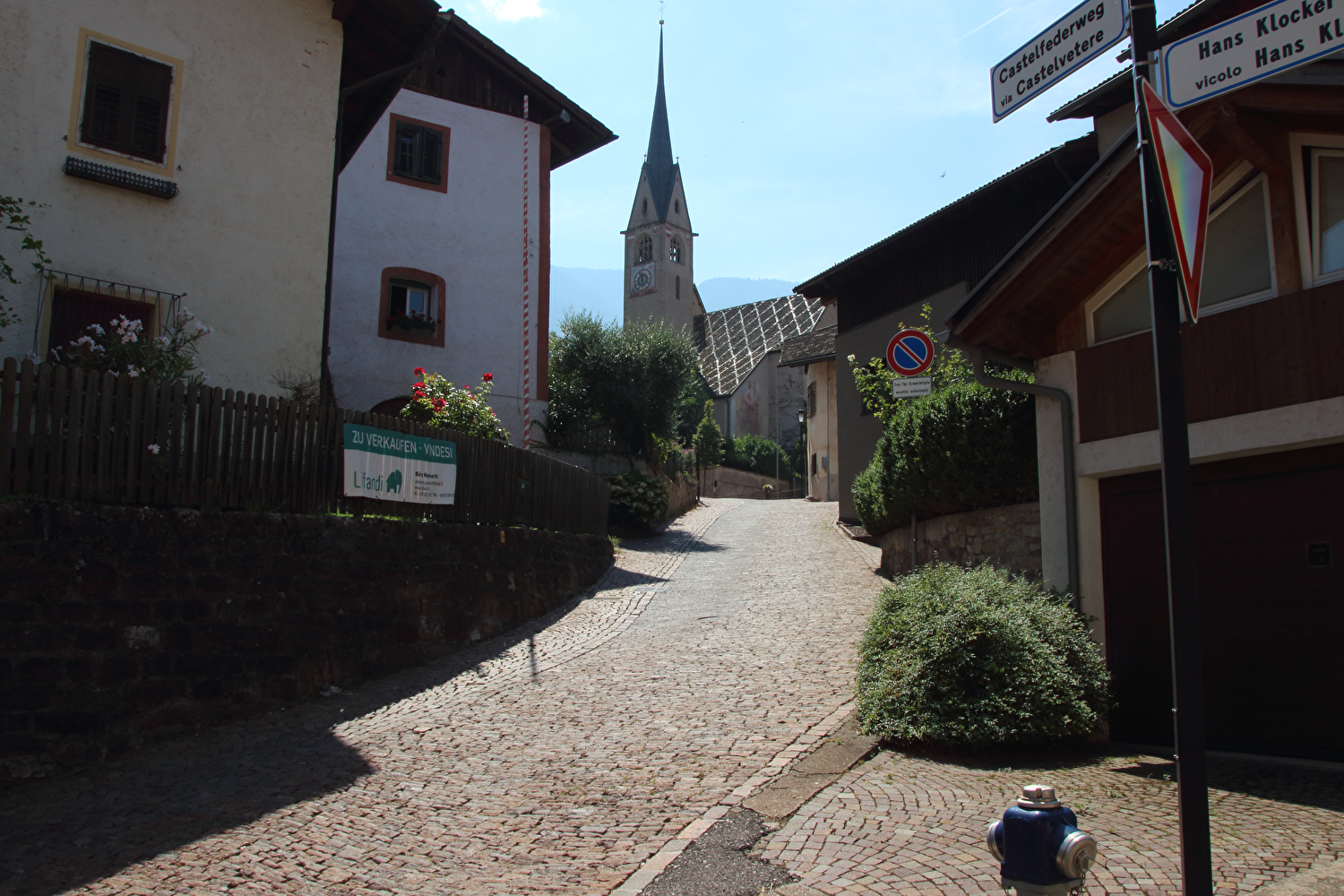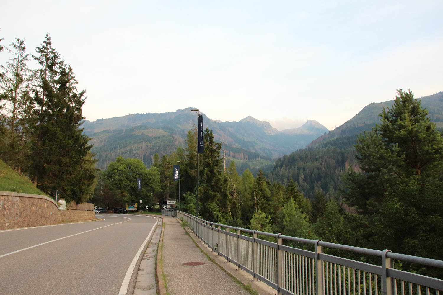 Wegen des sonnig-schwülheißen Wetters fiel die Wahl auf den Fleimstalbahn-Radweg. Die Luft war schon am Morgen zum Schneiden. Da musste nicht auch noch eine Wolke aus Autoabgasen und Feinstaub bergauf durchgezogen werden. Anders als auf dem Etsch-Radweg am Vortag hielt sich der Fahrradverkehr auf dem Fleimstalbahn-Radweg in überschaubaren Grenzen. Oberhalb des 2. Tunnels erfolgte eine baustellenbedingte Umleitung auf einem sehr steilen Weg nach Kalditsch, womit nach der kurzen steilen Rampe zwischen SS12 und ehemaliger Bahntrasse und der Ortsdurchfahrt Pinzon die dritte Schiebestrecke anstand. Von Kalditsch aus boten sich die letzten weiten Blicke ins Etschtal. Etwa ab Kalditsch besserte sich auch allmählich die Luftqualität, schwülwarm blieb es aber bis zum Etappenende. Nach reichlich mittelgebirgiger Landschaft zeigten sich mit dem Blick über San-Lugano auch wieder alpine Landschaften am Horizont. In San Lugano wurde für den Rest der Etappe auf die im Hang verlaufende SS48 gewechselt. Ein Wechsel auf den knapp südlich von San Lugano ausgeschildeten Radweg „pista ciclabile val di Fiemme-Fassa“ hätte zusätzliche Streckenkilometer und vor allem zusätzliche Höhenmeter bergauf gebracht, was im Rahmen dieser Etappe entbehrlich war. Zudem hätte der Wechsel eine Fahrt auf dem Talboden des Val di Fiemme bedeutet, wo es zum Abend hin schneller dunkel wurde und sich auch keine so weiten Blicke über das Tal wie von der SS48 aus geboten hätten. Knapp südlich von San-Lugano wurde die Grenze zwischen den Provinzen Südtirol (amtlich: „Autonome Provinz Bozen – Südtirol | Provincia Autonoma di Bolzano – Alto Adige“) und Trentino (amtlich: „Provincia autonoma di Trento“) und damit einhergehend auch die Sprachgrenze zwischen „bilingual deutsch & italienisch“ und „italienisch“ überquert. Zum späteren Nachmittag und Abend hin bildeten sich auch höhere Quellwolken, von denen einige nach Regen aussahen, aber es blieb bis zum Ende der Etappe trocken. Von der SS48 aus reichte der Blick bis zur Gruppo delle Pale in den Dolomiten, die kurz vor Etappenende Alpenglühen zeigte.