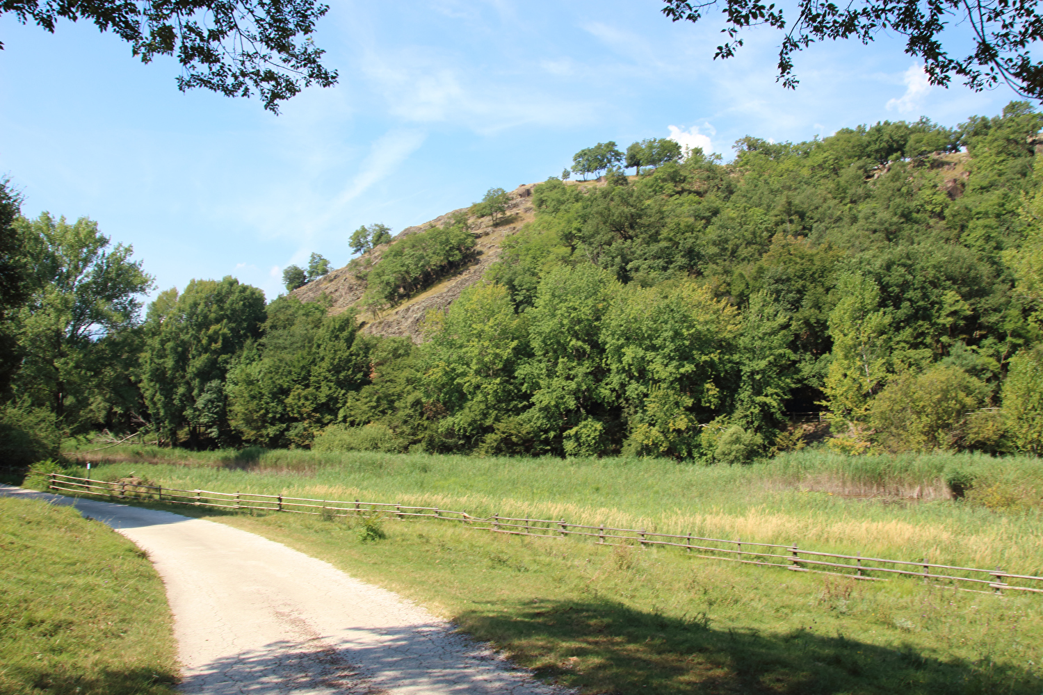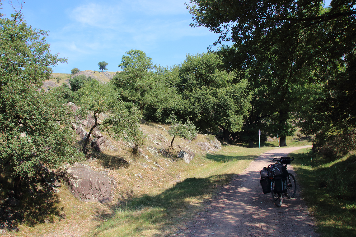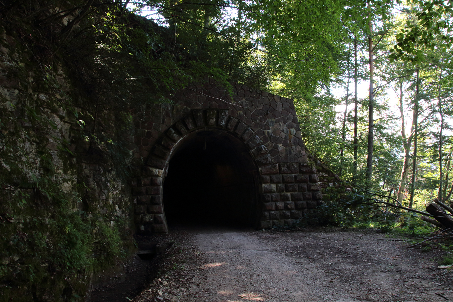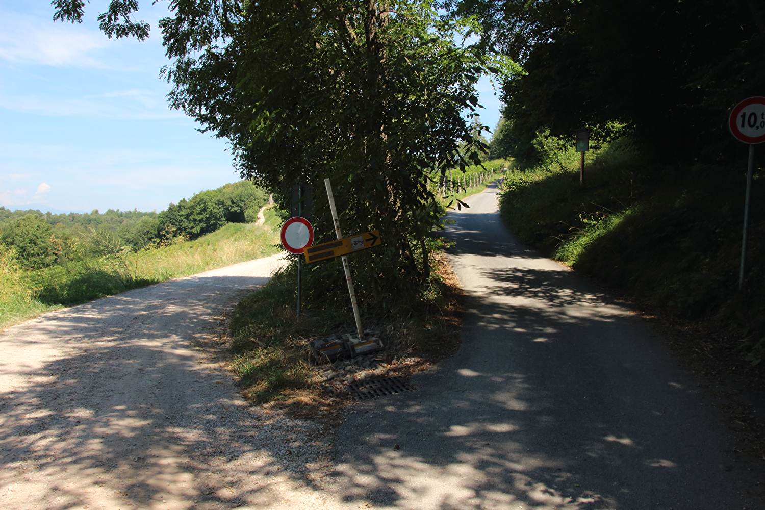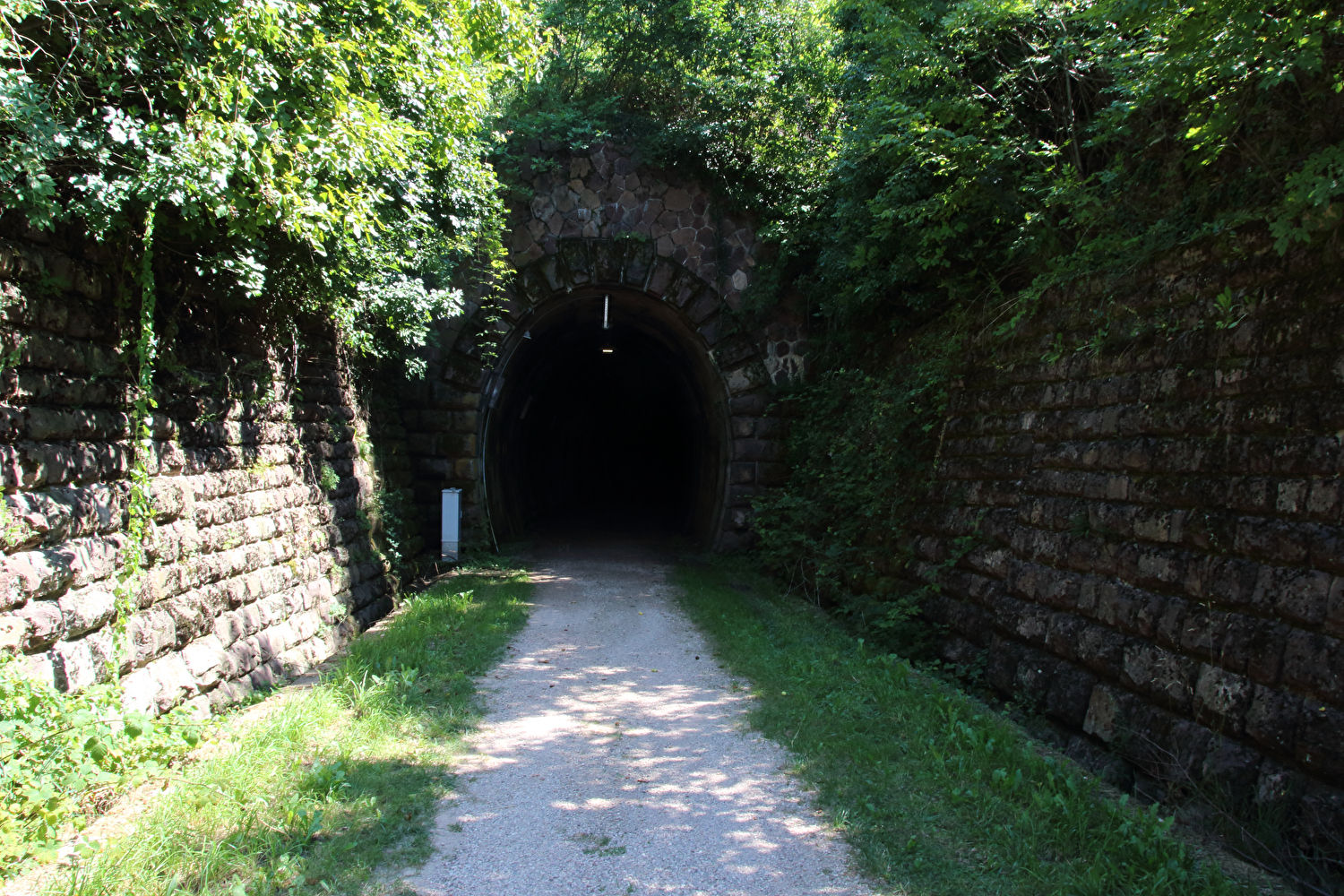 Wegen des sonnig-schwülheißen Wetters fiel die Wahl auf den Fleimstalbahn-Radweg. Die Luft war schon am Morgen zum Schneiden. Da musste nicht auch noch eine Wolke aus Autoabgasen und Feinstaub bergauf durchgezogen werden. Anders als auf dem Etsch-Radweg am Vortag hielt sich der Fahrradverkehr auf dem Fleimstalbahn-Radweg in überschaubaren Grenzen. Oberhalb des 2. Tunnels erfolgte eine baustellenbedingte Umleitung auf einem sehr steilen Weg nach Kalditsch, womit nach der kurzen steilen Rampe zwischen SS12 und ehemaliger Bahntrasse und der Ortsdurchfahrt Pinzon die dritte Schiebestrecke anstand. Von Kalditsch aus boten sich die letzten weiten Blicke ins Etschtal. Etwa ab Kalditsch besserte sich auch allmählich die Luftqualität, schwülwarm blieb es aber bis zum Etappenende. Nach reichlich mittelgebirgiger Landschaft zeigten sich mit dem Blick über San-Lugano auch wieder alpine Landschaften am Horizont. In San Lugano wurde für den Rest der Etappe auf die im Hang verlaufende SS48 gewechselt. Ein Wechsel auf den knapp südlich von San Lugano ausgeschildeten Radweg „pista ciclabile val di Fiemme-Fassa“ hätte zusätzliche Streckenkilometer und vor allem zusätzliche Höhenmeter bergauf gebracht, was im Rahmen dieser Etappe entbehrlich war. Zudem hätte der Wechsel eine Fahrt auf dem Talboden des Val di Fiemme bedeutet, wo es zum Abend hin schneller dunkel wurde und sich auch keine so weiten Blicke über das Tal wie von der SS48 aus geboten hätten. Knapp südlich von San-Lugano wurde die Grenze zwischen den Provinzen Südtirol (amtlich: „Autonome Provinz Bozen – Südtirol | Provincia Autonoma di Bolzano – Alto Adige“) und Trentino (amtlich: „Provincia autonoma di Trento“) und damit einhergehend auch die Sprachgrenze zwischen „bilingual deutsch & italienisch“ und „italienisch“ überquert. Zum späteren Nachmittag und Abend hin bildeten sich auch höhere Quellwolken, von denen einige nach Regen aussahen, aber es blieb bis zum Ende der Etappe trocken. Von der SS48 aus reichte der Blick bis zur Gruppo delle Pale in den Dolomiten, die kurz vor Etappenende Alpenglühen zeigte.