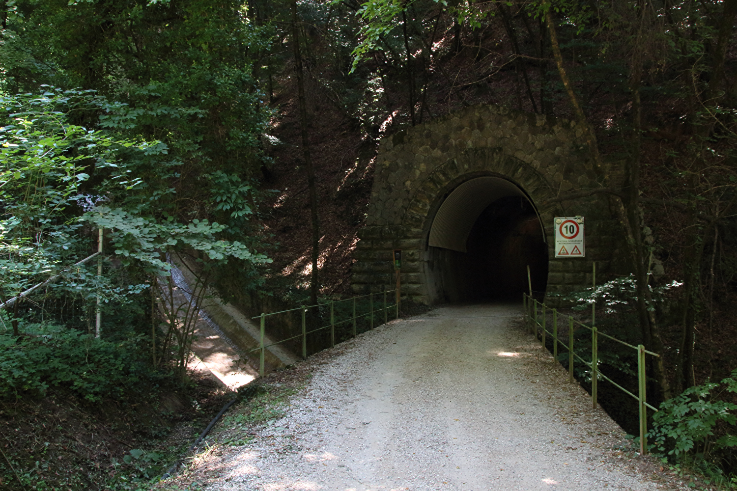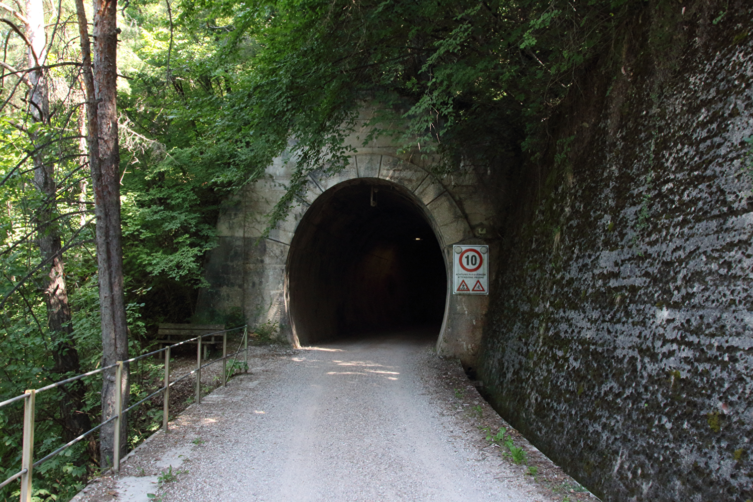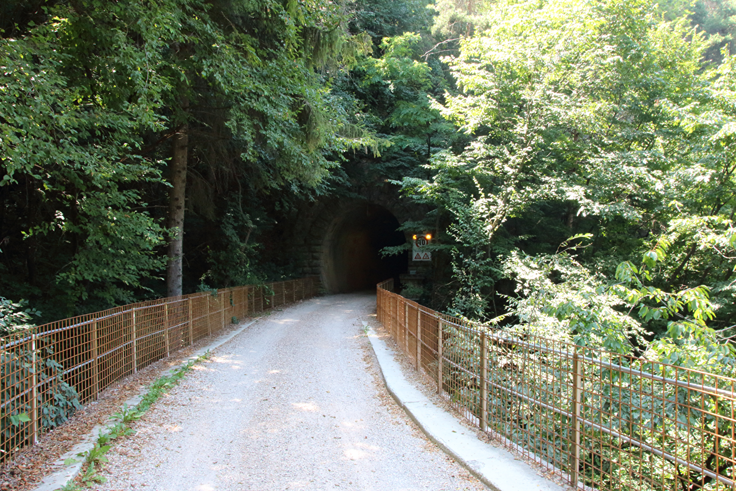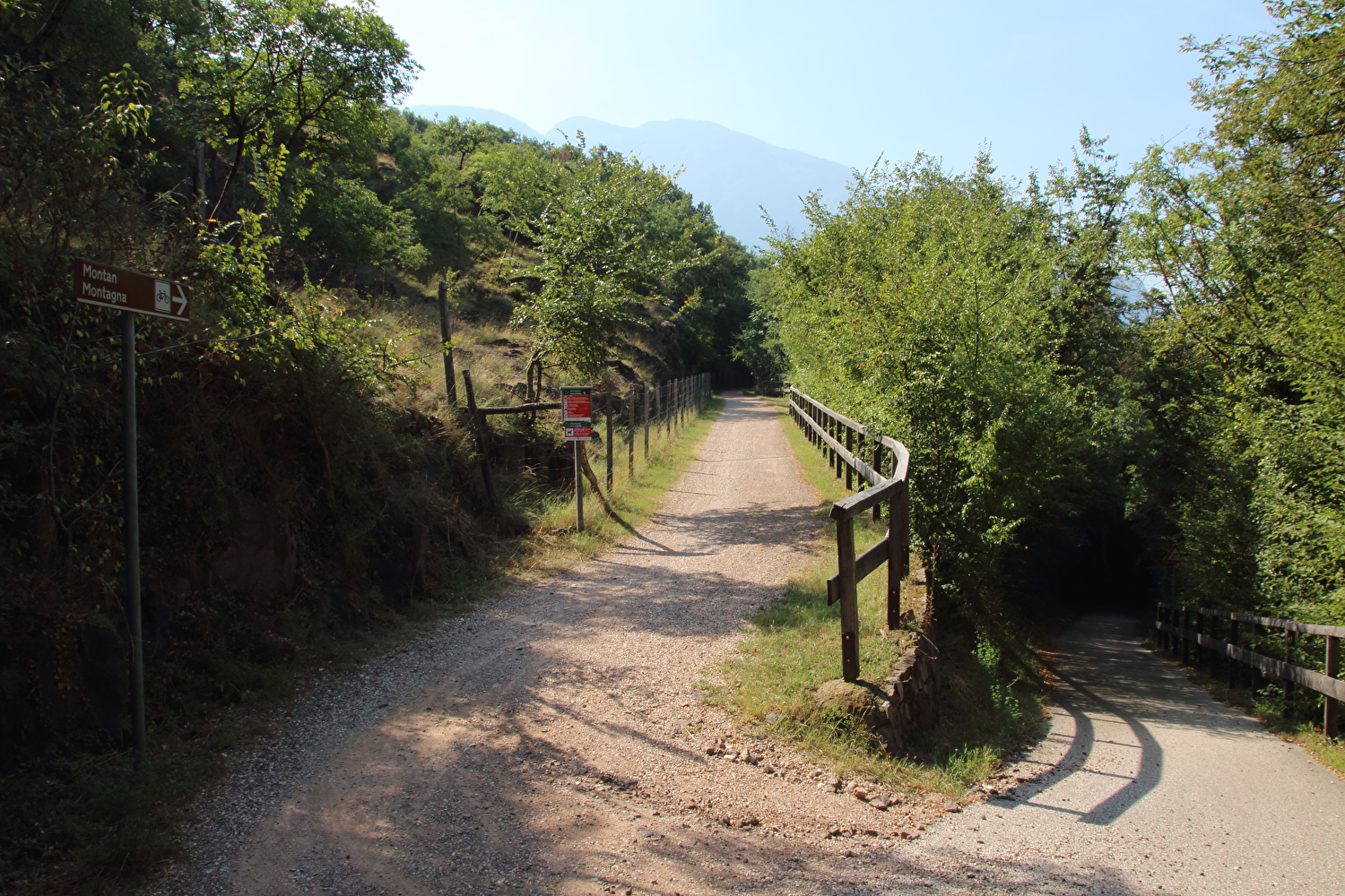 Für die Route von Auer bis zum San-Lugano-Sattel gibt es zwei Möglichkeiten, entweder die stark mit Stinkeverkehr belastete SS48, die auf längeren Abschnitten im Talgrund verläuft, oder den als Schotterpiste ausgeführten Fleimstalbahn-Radweg, der abseits vom Talgrund im Hang verläuft, fünf Tunneldurchfahrten bietet und weiter oben im Wald verläuft. Die Fleimstalbahn war eine schmalspurige Eisenbahn zwischen Auer im Etschtal und Predazzo im Fleimstal. Die Bahntrasse wurde als Adhäsionsbahn zunächst mit einer Spurweite von 760 mm angelegt, wobei eine Umspurung auf Meterspur bereits eingeplant wurde. Der Regelbetrieb wurde im Jahr 1918 aufgenommen. Die Umspurung auf Meterspur erfolgte zusammen mit der Elektrifizierung im Jahr 1929. Der Betrieb wurde im Jahr 1963 entgültig eingestellt. Auf der ehemaligen Bahntrasse steigt der Radweg moderat und sehr gleichmäßig an. Bei Pinzon verlässt der Radweg allerdings die ehemalige Bahntrasse und durchquert den Ort mit bis zu 20 % Neigung, was für einen Radweg eine krasse Fehlplanung darstellt. In Montan an der Weinstraße wechselt der Radweg wieder auf die ehemalige Bahntrasse.