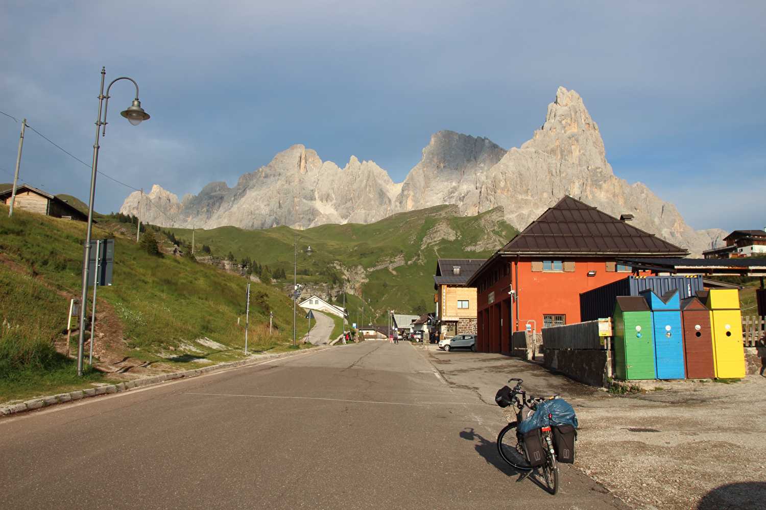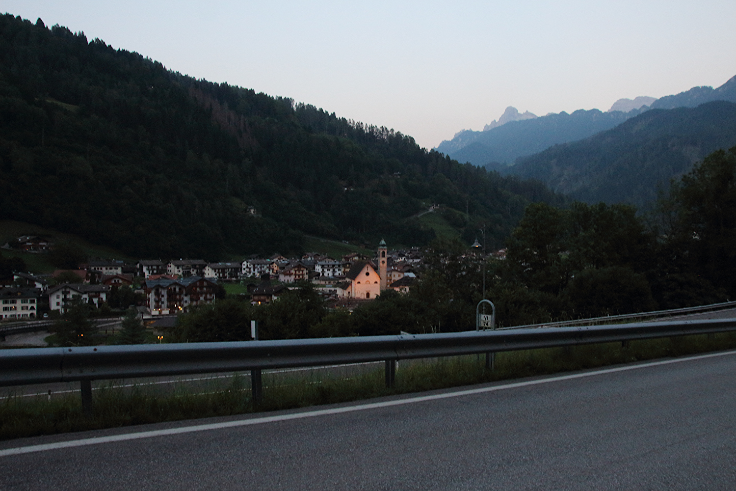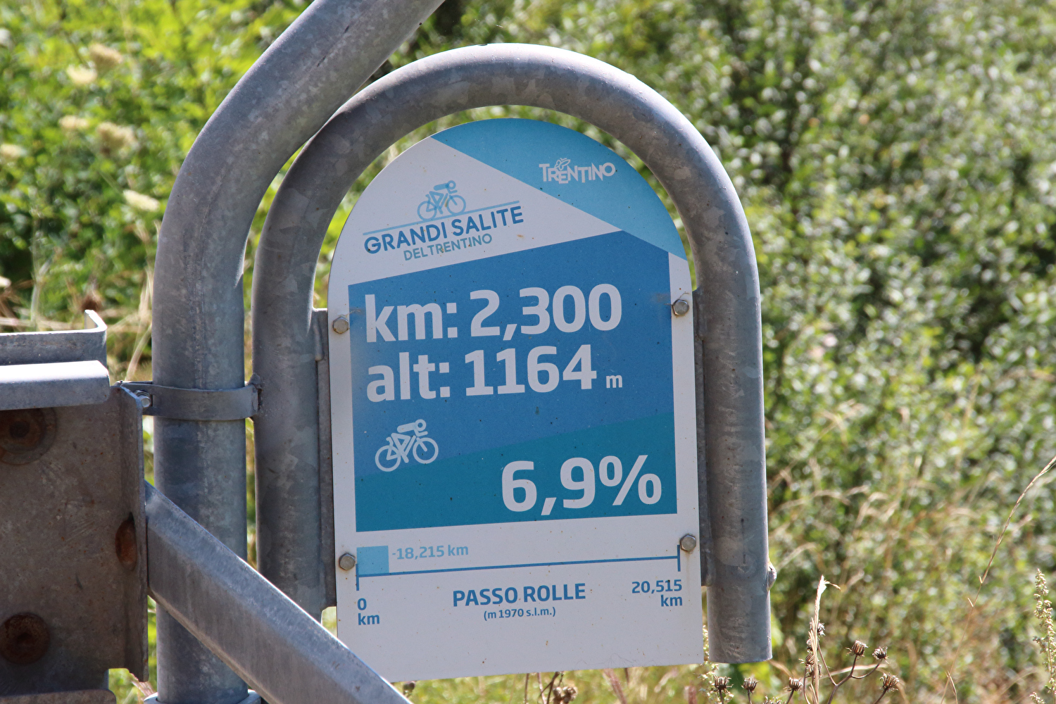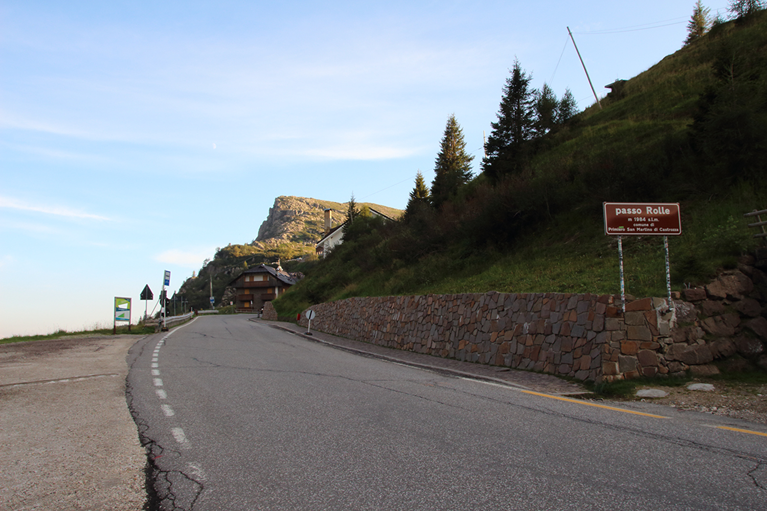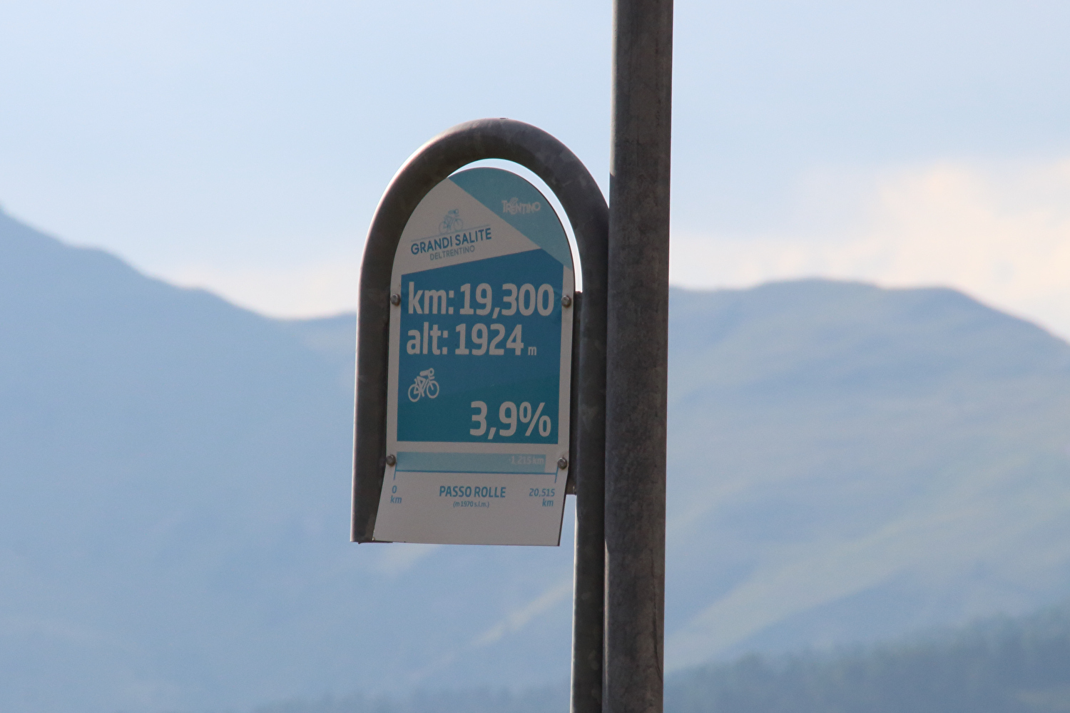 Die Etappe startete bei sonnigem schwülwarmem Wetter. Von Ziano di Fiemme bis Predazzo wurde auf dem Radweg „pista ciclabile val di Fiemme-Fassa“ bis Predazzo gefahren. Ab Predazzo gab es aber kein Entkommen mehr aus der Autoabgas- und Feinstaubwolke, die über der Straße hing. Der Stinkeverkehr reihte sich ab Predazzo immer wieder Stoßstange an Stoßstange. Zu allem Überfluss hatten die Italiener ihre Kleinwagenflotte früherer Jahre mittlerweile größtenteils durch Stadtpanzer ersetzt, obwohl die Straßen in dieser Zeit nicht breiter geworden waren. Diese Stadtpanzer brachten nicht nur noch mehr Autoabgase und Feinstaub, sodern ließen auch nahezu jede Begegnung eng bis gefährlich eng werden. Das schwülwarme Wetter blieb nicht ohne Folgen. Oberhalb von Paneveggio setzte von Süden kommend Regen ein, der das Anlegen der Norddeutschen Trachtenkleidung (mit kurzer Regenhose) erforderte. Weiter oben zog der Regen nach Norden ab, sodass noch vor der Passhöhe wieder im Trockenen ohne Regenkleidung gefahren werden konnte. Kurz vor Erreichen der Passhöhe kam sogar wieder die Sonne raus. Zu Beginn der Abfahrt rückte mit dem Cimon della Pala zum letzten Mal im Rahmen dieser Tour ein Dreitausender in die Nähe. Mit der Abfahrt nach Siror, die bedingt durch Topografie und Sonnenstand im Schatten verlief, endete der hochalpine Teil dieser Tour. Da die Passstraße auf längeren Abschnitten durch Wald verläuft, wo sich nur selten Weitblicke bieten, gibt es vergleichsweise wenig Fotos von dieser Etappe.