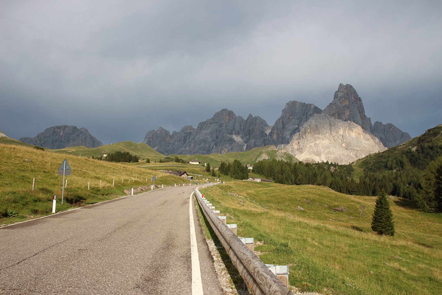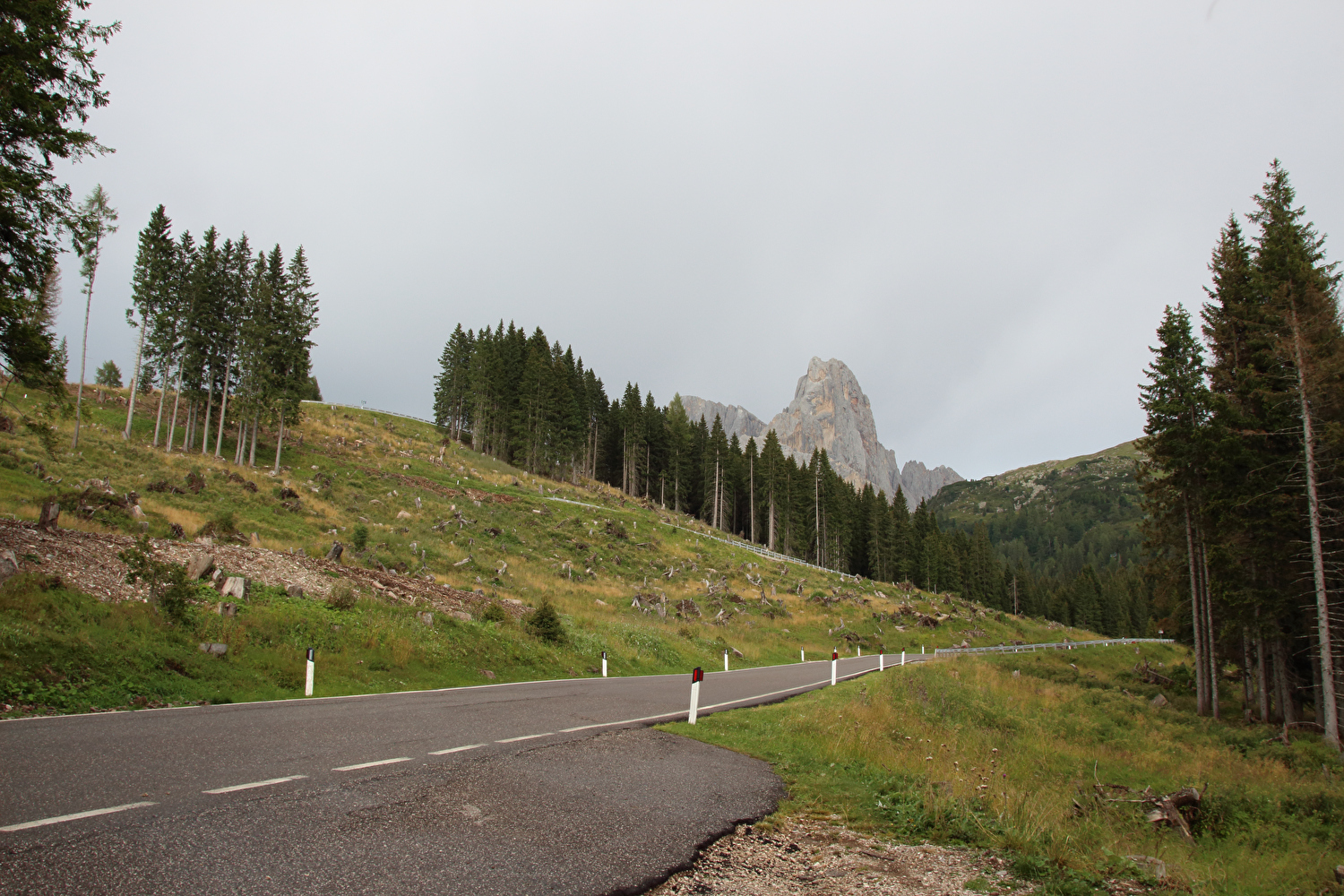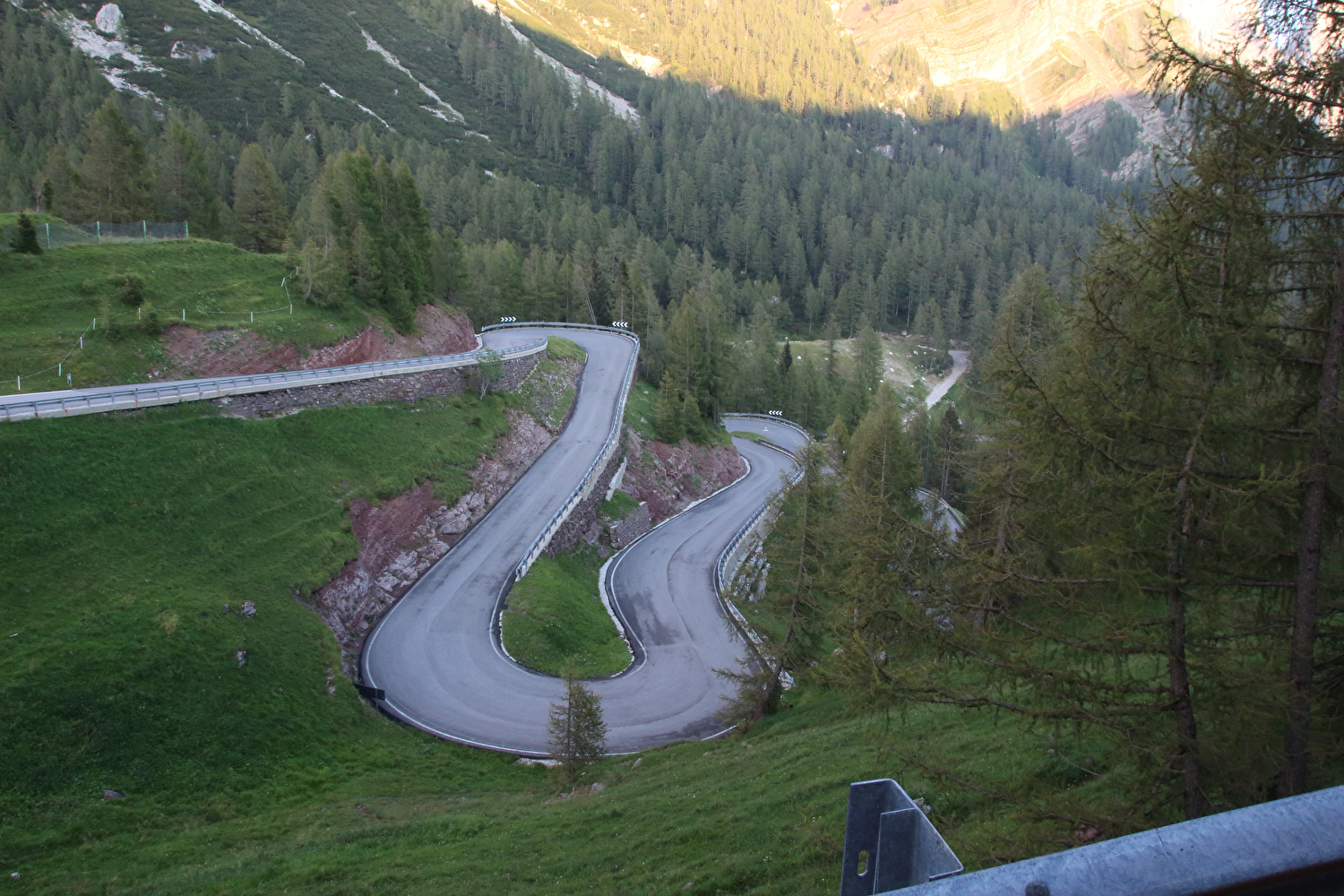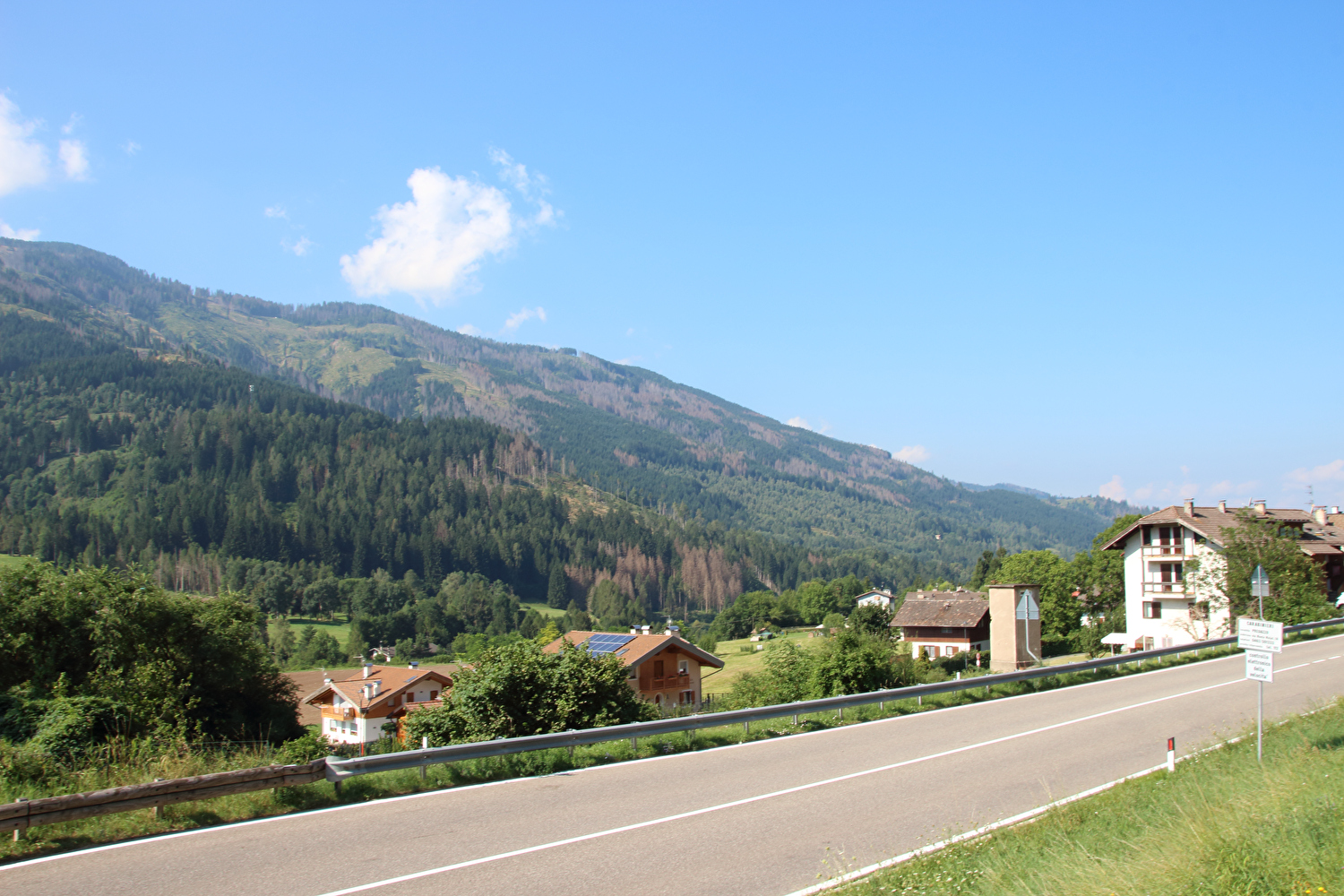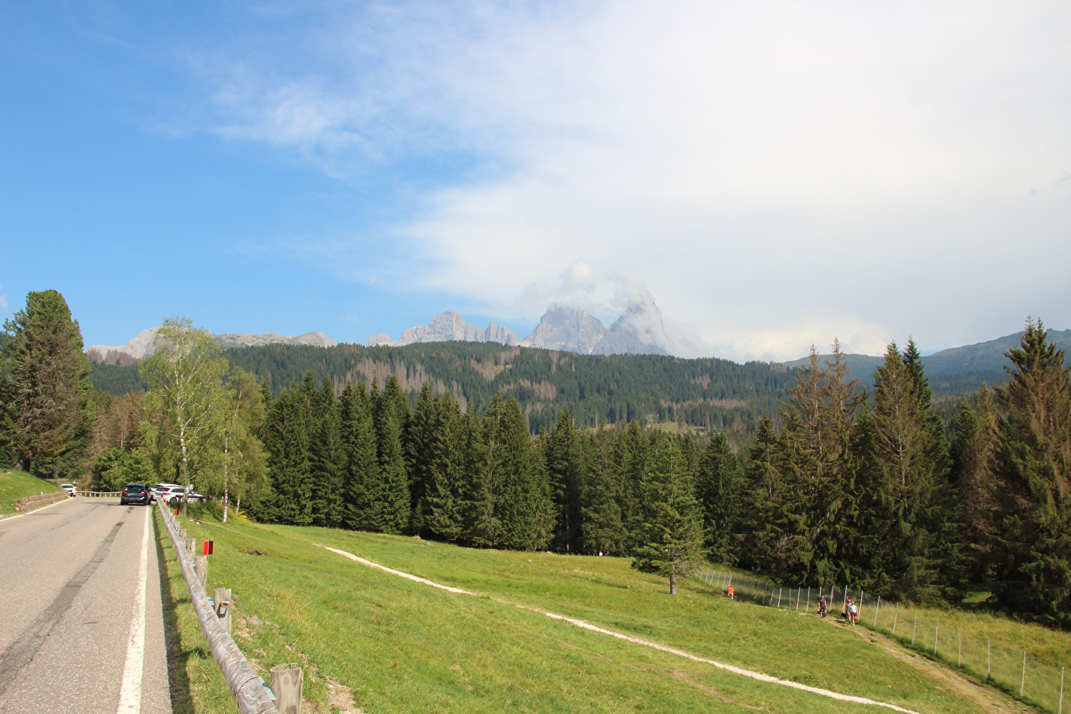 Die Etappe startete bei sonnigem schwülwarmem Wetter. Von Ziano di Fiemme bis Predazzo wurde auf dem Radweg „pista ciclabile val di Fiemme-Fassa“ bis Predazzo gefahren. Ab Predazzo gab es aber kein Entkommen mehr aus der Autoabgas- und Feinstaubwolke, die über der Straße hing. Der Stinkeverkehr reihte sich ab Predazzo immer wieder Stoßstange an Stoßstange. Zu allem Überfluss hatten die Italiener ihre Kleinwagenflotte früherer Jahre mittlerweile größtenteils durch Stadtpanzer ersetzt, obwohl die Straßen in dieser Zeit nicht breiter geworden waren. Diese Stadtpanzer brachten nicht nur noch mehr Autoabgase und Feinstaub, sodern ließen auch nahezu jede Begegnung eng bis gefährlich eng werden. Das schwülwarme Wetter blieb nicht ohne Folgen. Oberhalb von Paneveggio setzte von Süden kommend Regen ein, der das Anlegen der Norddeutschen Trachtenkleidung (mit kurzer Regenhose) erforderte. Weiter oben zog der Regen nach Norden ab, sodass noch vor der Passhöhe wieder im Trockenen ohne Regenkleidung gefahren werden konnte. Kurz vor Erreichen der Passhöhe kam sogar wieder die Sonne raus. Zu Beginn der Abfahrt rückte mit dem Cimon della Pala zum letzten Mal im Rahmen dieser Tour ein Dreitausender in die Nähe. Mit der Abfahrt nach Siror, die bedingt durch Topografie und Sonnenstand im Schatten verlief, endete der hochalpine Teil dieser Tour. Da die Passstraße auf längeren Abschnitten durch Wald verläuft, wo sich nur selten Weitblicke bieten, gibt es vergleichsweise wenig Fotos von dieser Etappe.