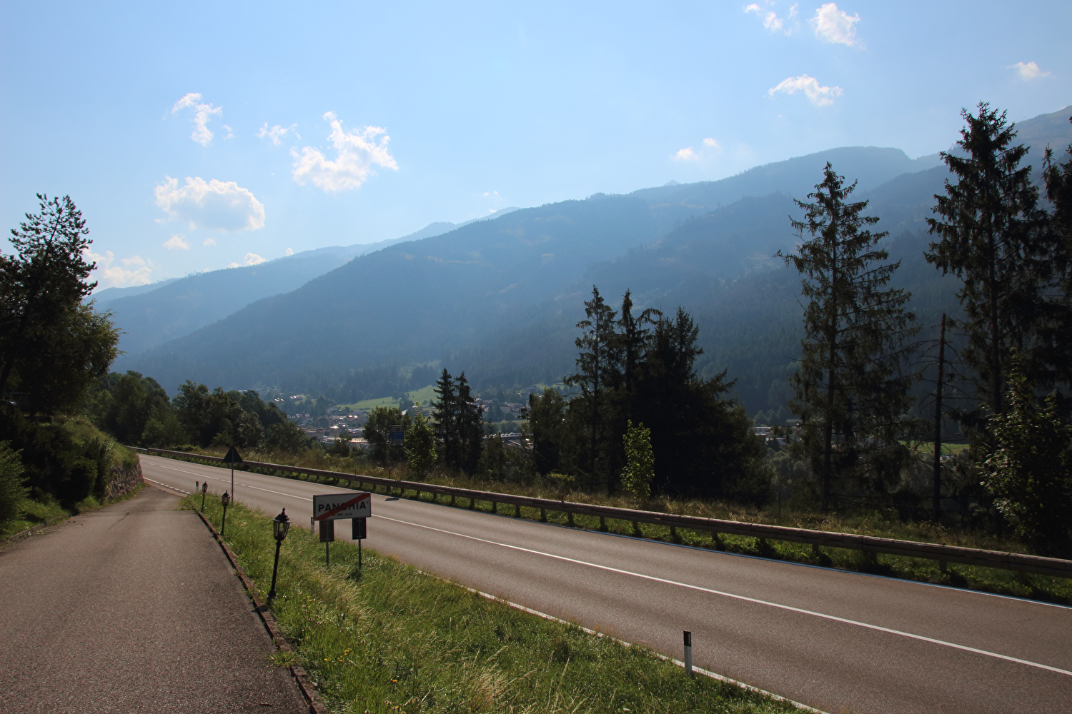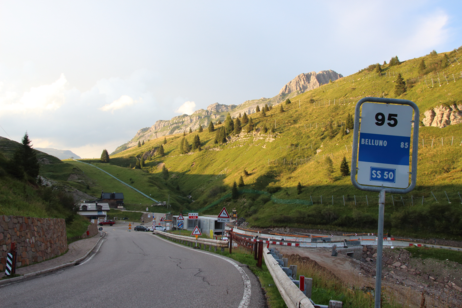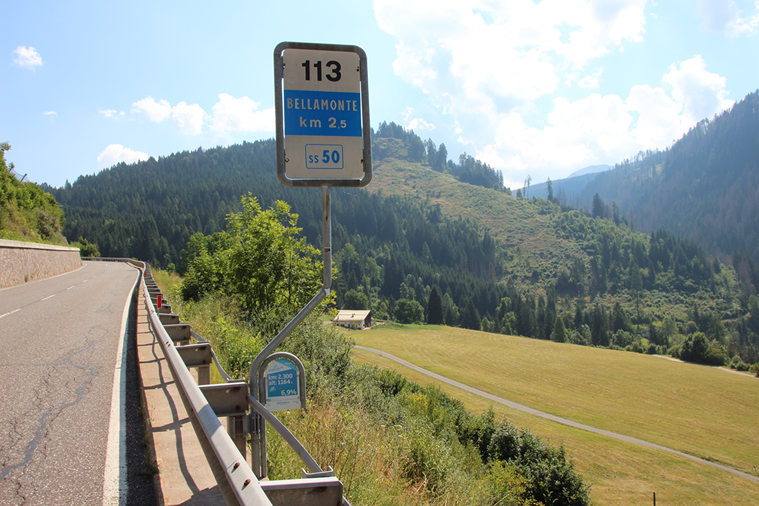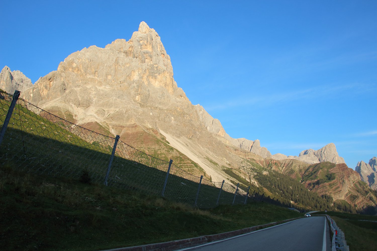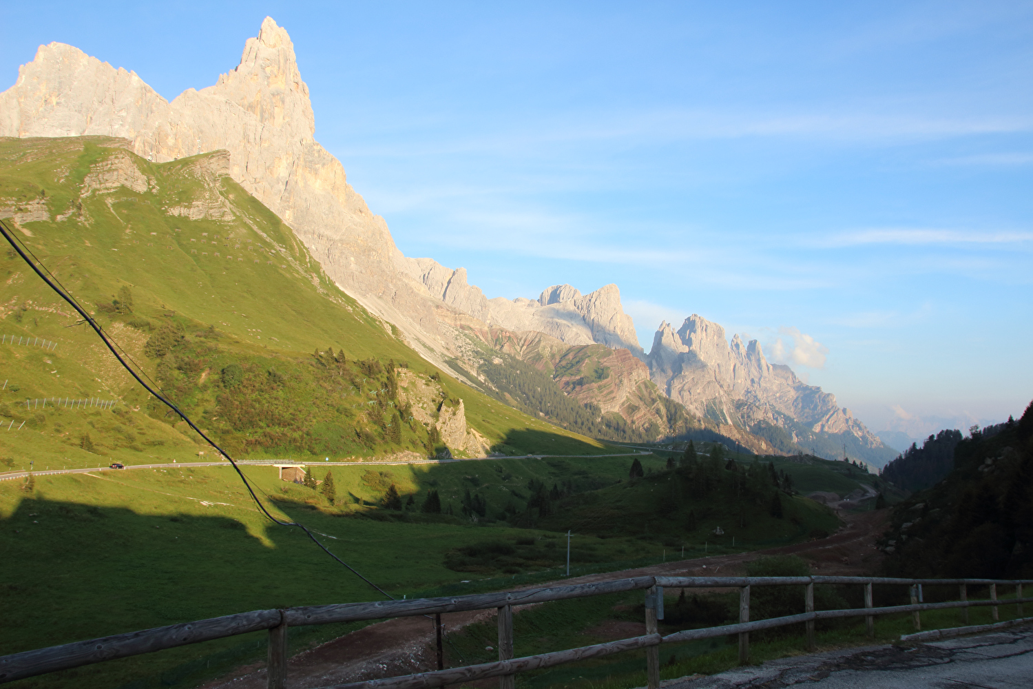 Die Etappe startete bei sonnigem schwülwarmem Wetter. Von Ziano di Fiemme bis Predazzo wurde auf dem Radweg „pista ciclabile val di Fiemme-Fassa“ bis Predazzo gefahren. Ab Predazzo gab es aber kein Entkommen mehr aus der Autoabgas- und Feinstaubwolke, die über der Straße hing. Der Stinkeverkehr reihte sich ab Predazzo immer wieder Stoßstange an Stoßstange. Zu allem Überfluss hatten die Italiener ihre Kleinwagenflotte früherer Jahre mittlerweile größtenteils durch Stadtpanzer ersetzt, obwohl die Straßen in dieser Zeit nicht breiter geworden waren. Diese Stadtpanzer brachten nicht nur noch mehr Autoabgase und Feinstaub, sodern ließen auch nahezu jede Begegnung eng bis gefährlich eng werden. Das schwülwarme Wetter blieb nicht ohne Folgen. Oberhalb von Paneveggio setzte von Süden kommend Regen ein, der das Anlegen der Norddeutschen Trachtenkleidung (mit kurzer Regenhose) erforderte. Weiter oben zog der Regen nach Norden ab, sodass noch vor der Passhöhe wieder im Trockenen ohne Regenkleidung gefahren werden konnte. Kurz vor Erreichen der Passhöhe kam sogar wieder die Sonne raus. Zu Beginn der Abfahrt rückte mit dem Cimon della Pala zum letzten Mal im Rahmen dieser Tour ein Dreitausender in die Nähe. Mit der Abfahrt nach Siror, die bedingt durch Topografie und Sonnenstand im Schatten verlief, endete der hochalpine Teil dieser Tour. Da die Passstraße auf längeren Abschnitten durch Wald verläuft, wo sich nur selten Weitblicke bieten, gibt es vergleichsweise wenig Fotos von dieser Etappe.