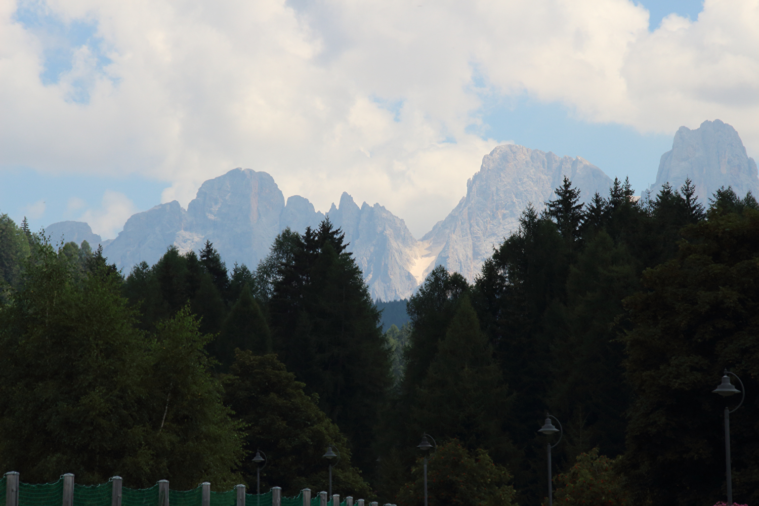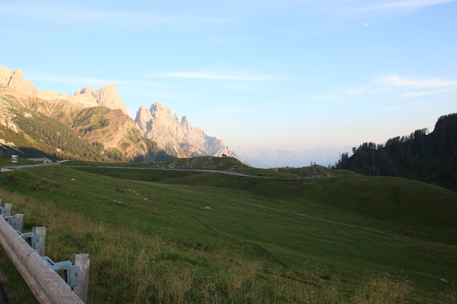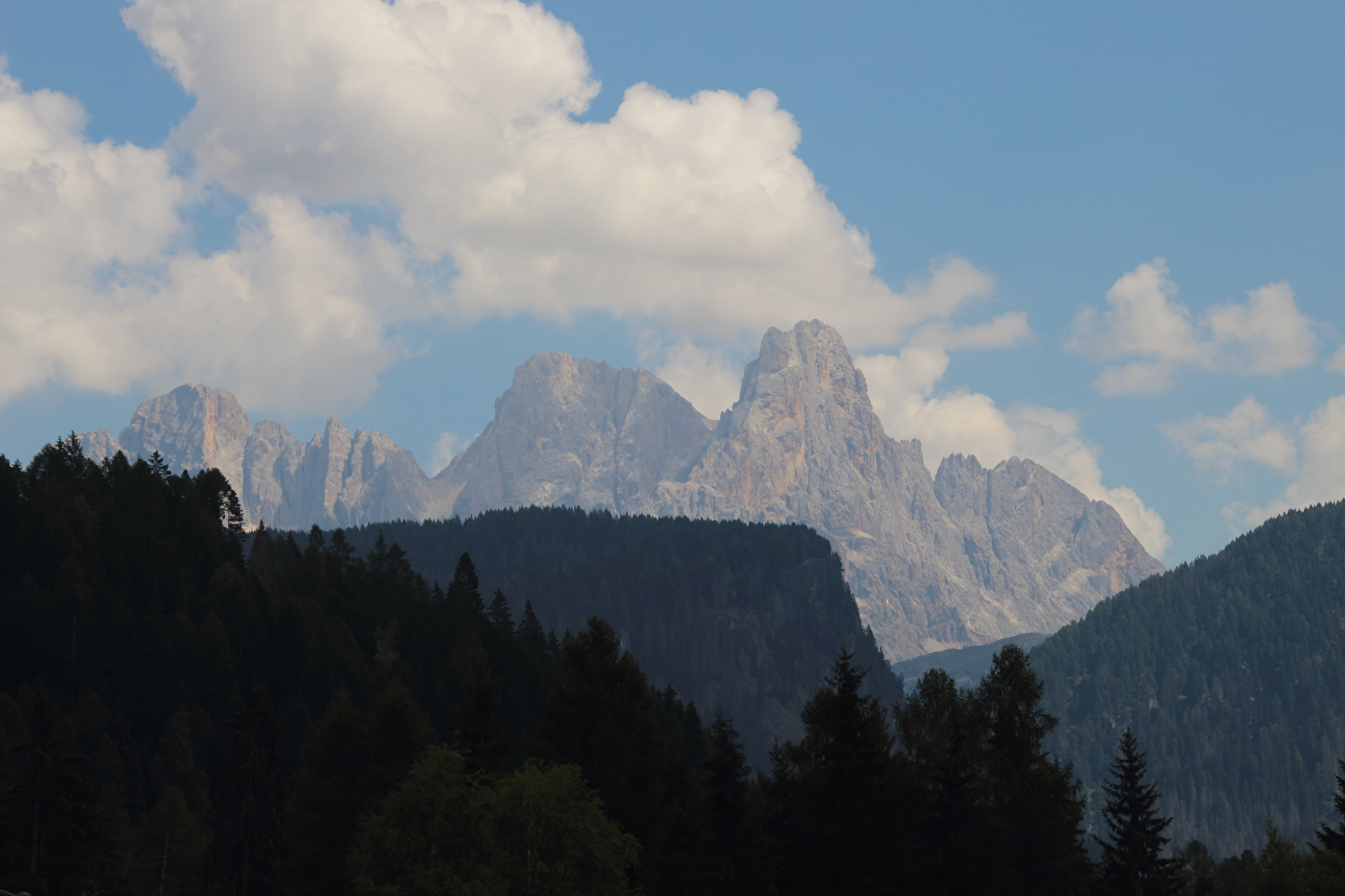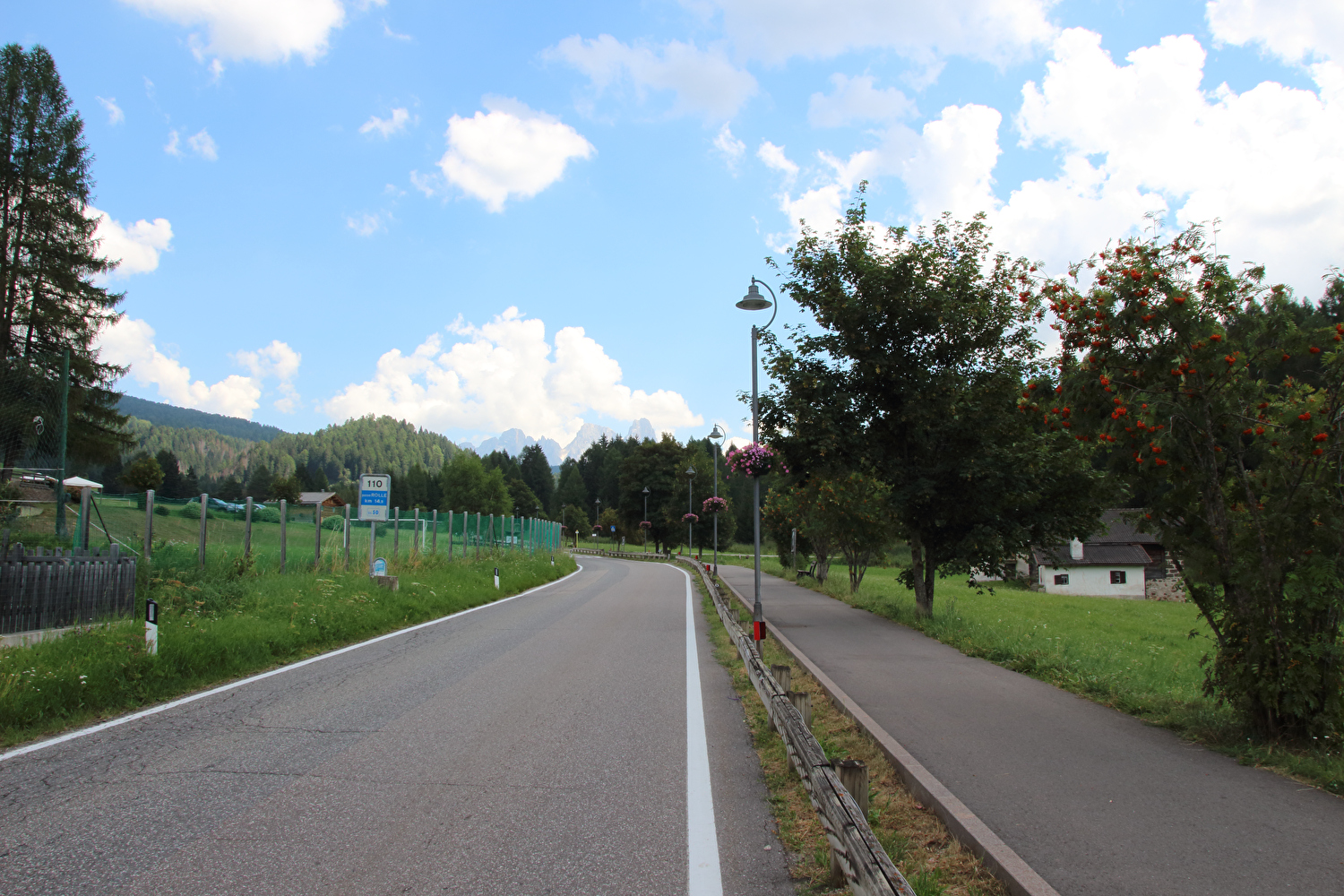Die Etappe startete bei sonnigem schwülwarmem Wetter. Von Ziano di Fiemme bis Predazzo wurde auf dem Radweg „pista ciclabile val di Fiemme-Fassa“ bis Predazzo gefahren. Ab Predazzo gab es aber kein Entkommen mehr aus der Autoabgas- und Feinstaubwolke, die über der Straße hing. Der Stinkeverkehr reihte sich ab Predazzo immer wieder Stoßstange an Stoßstange. Zu allem Überfluss hatten die Italiener ihre Kleinwagenflotte früherer Jahre mittlerweile größtenteils durch Stadtpanzer ersetzt, obwohl die Straßen in dieser Zeit nicht breiter geworden waren. Diese Stadtpanzer brachten nicht nur noch mehr Autoabgase und Feinstaub, sodern ließen auch nahezu jede Begegnung eng bis gefährlich eng werden. Das schwülwarme Wetter blieb nicht ohne Folgen. Oberhalb von Paneveggio setzte von Süden kommend Regen ein, der das Anlegen der Norddeutschen Trachtenkleidung (mit kurzer Regenhose) erforderte. Weiter oben zog der Regen nach Norden ab, sodass noch vor der Passhöhe wieder im Trockenen ohne Regenkleidung gefahren werden konnte. Kurz vor Erreichen der Passhöhe kam sogar wieder die Sonne raus. Zu Beginn der Abfahrt rückte mit dem Cimon della Pala zum letzten Mal im Rahmen dieser Tour ein Dreitausender in die Nähe. Mit der Abfahrt nach Siror, die bedingt durch Topografie und Sonnenstand im Schatten verlief, endete der hochalpine Teil dieser Tour. Da die Passstraße auf längeren Abschnitten durch Wald verläuft, wo sich nur selten Weitblicke bieten, gibt es vergleichsweise wenig Fotos von dieser Etappe.