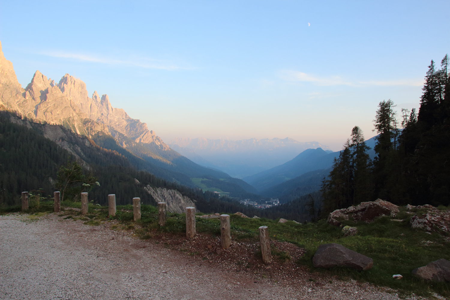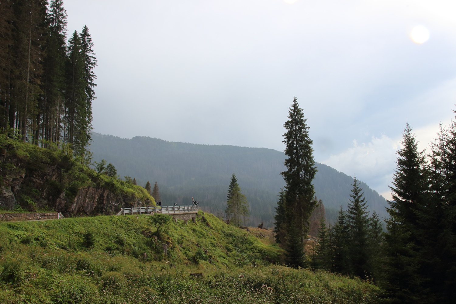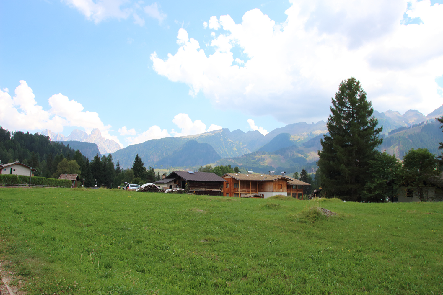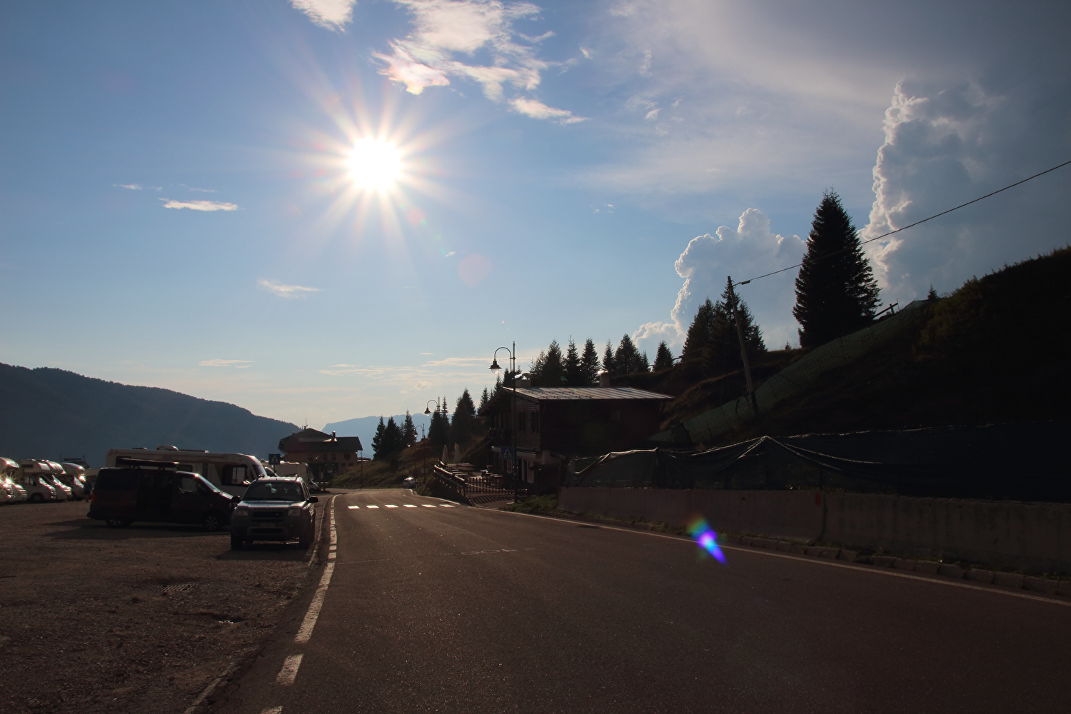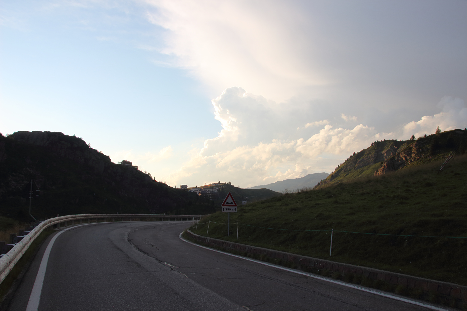 Die Etappe startete bei sonnigem schwülwarmem Wetter. Von Ziano di Fiemme bis Predazzo wurde auf dem Radweg „pista ciclabile val di Fiemme-Fassa“ bis Predazzo gefahren. Ab Predazzo gab es aber kein Entkommen mehr aus der Autoabgas- und Feinstaubwolke, die über der Straße hing. Der Stinkeverkehr reihte sich ab Predazzo immer wieder Stoßstange an Stoßstange. Zu allem Überfluss hatten die Italiener ihre Kleinwagenflotte früherer Jahre mittlerweile größtenteils durch Stadtpanzer ersetzt, obwohl die Straßen in dieser Zeit nicht breiter geworden waren. Diese Stadtpanzer brachten nicht nur noch mehr Autoabgase und Feinstaub, sodern ließen auch nahezu jede Begegnung eng bis gefährlich eng werden. Das schwülwarme Wetter blieb nicht ohne Folgen. Oberhalb von Paneveggio setzte von Süden kommend Regen ein, der das Anlegen der Norddeutschen Trachtenkleidung (mit kurzer Regenhose) erforderte. Weiter oben zog der Regen nach Norden ab, sodass noch vor der Passhöhe wieder im Trockenen ohne Regenkleidung gefahren werden konnte. Kurz vor Erreichen der Passhöhe kam sogar wieder die Sonne raus. Zu Beginn der Abfahrt rückte mit dem Cimon della Pala zum letzten Mal im Rahmen dieser Tour ein Dreitausender in die Nähe. Mit der Abfahrt nach Siror, die bedingt durch Topografie und Sonnenstand im Schatten verlief, endete der hochalpine Teil dieser Tour. Da die Passstraße auf längeren Abschnitten durch Wald verläuft, wo sich nur selten Weitblicke bieten, gibt es vergleichsweise wenig Fotos von dieser Etappe.