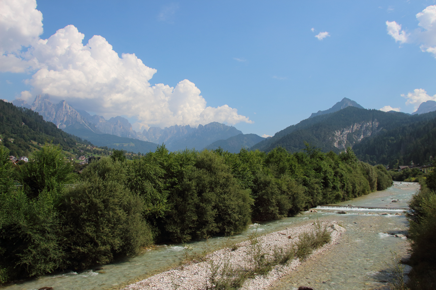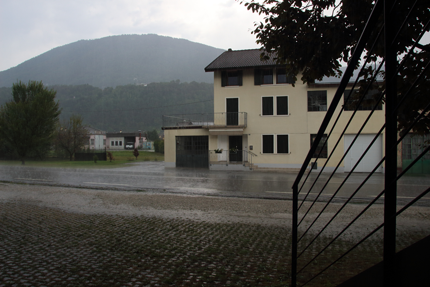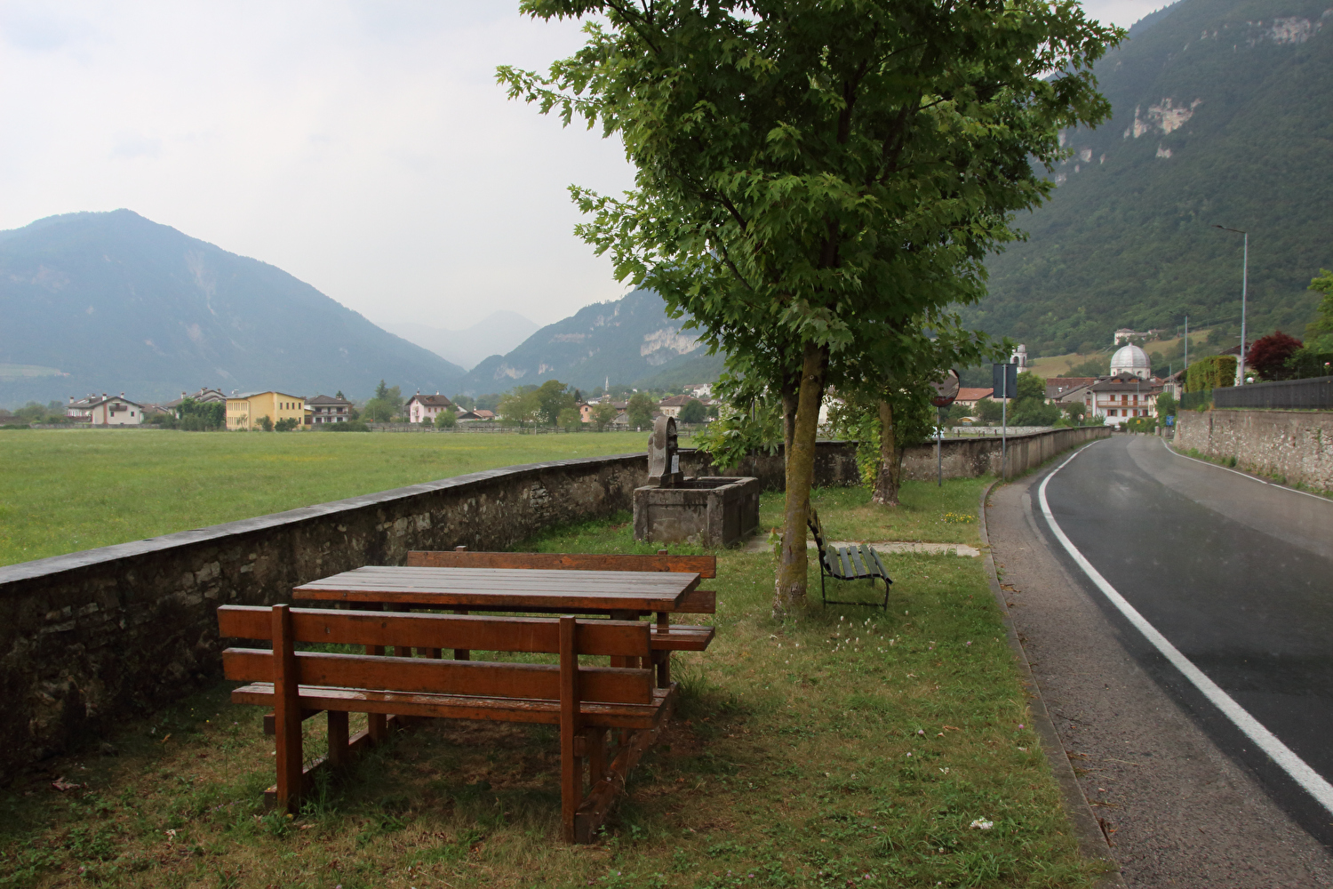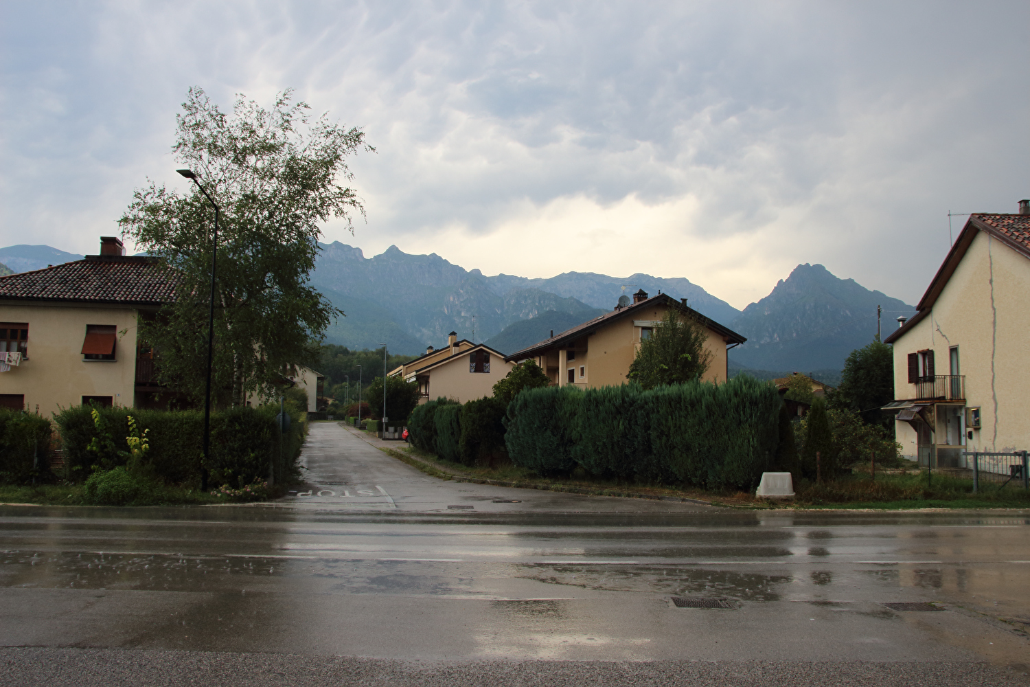 Die genaue Lage der Talwasserscheide ließ sich vor Ort nicht bestimmen. Als Ersatz dafür kam in Arten das Wasser von oben. Der Regen intensivierte sich bis Feltre zu Starkregen, der im Westen von Feltre unter einem Dach abgewartet wurde. Aufgund der Kürze dieser Flachetappe war dafür genug Zeit. Bei wieder nachlassendem Regen wurde die Fahrt zum Quartier in Feltre fortgesetzt.