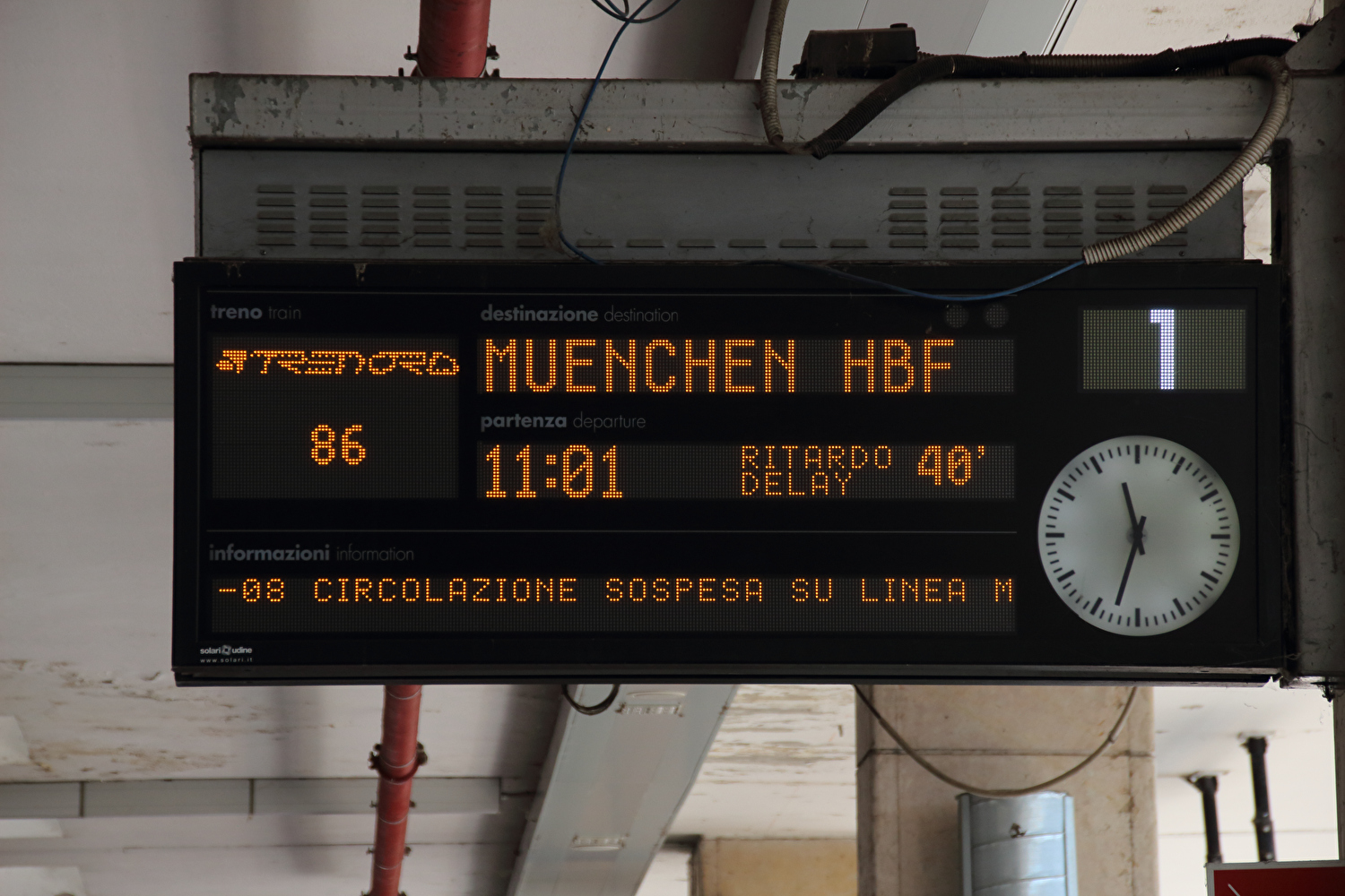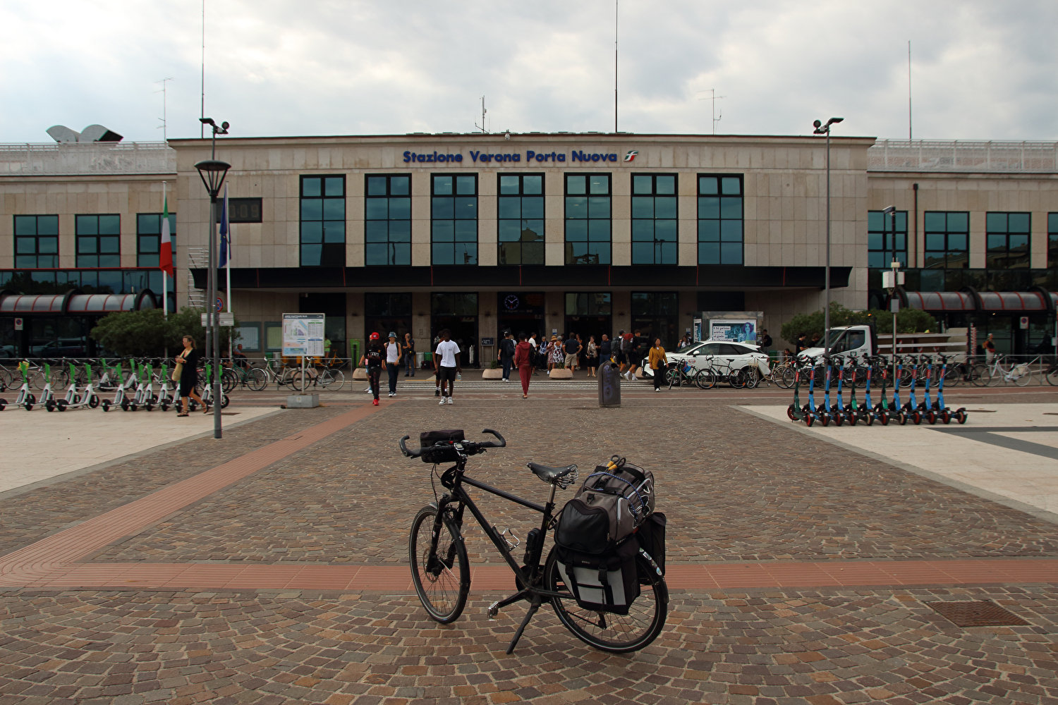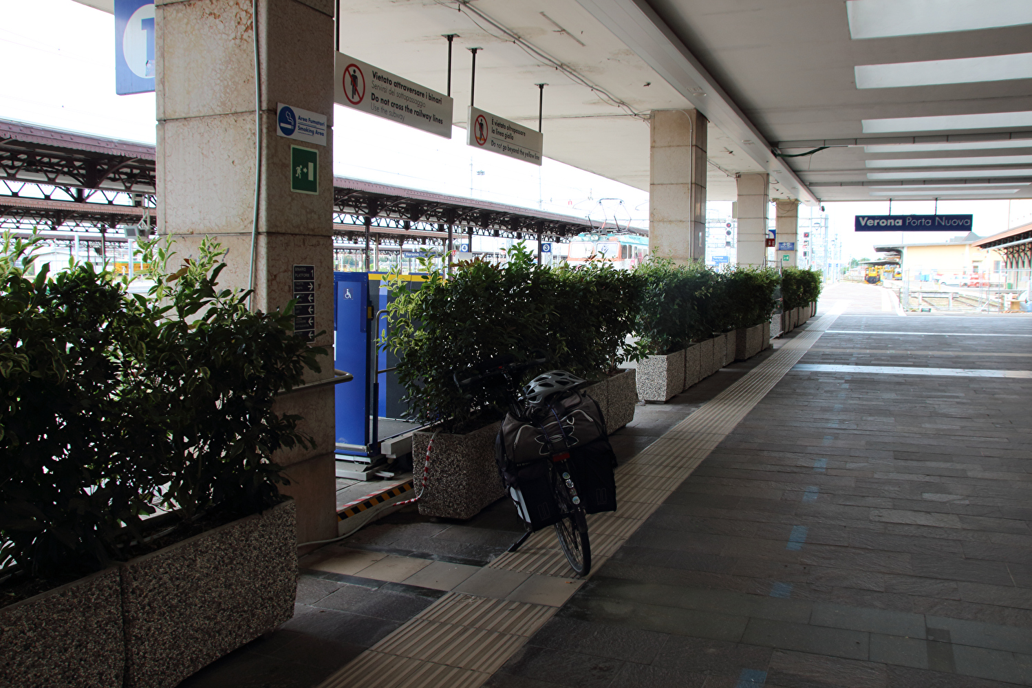 Auch am Abreisetag lag eine drückende Schwüle über Verona. Am Bahnsteig begann dann das lange Warten. Die Zugverspätung wuchs in 5-Minuten-Schritten bis auf 40 min an. Eigentlich sollte bei einer Verbindung mit nur einem Umstieg mit fahrplanmäßig 80 min Umsteigezeit nichts schief gehen, aber die Bahn bewies an diesem Tag eindrucksvoll das Gegenteil. In Österreich lag die Verspätung bei ca. 50 min. In Deutschland hieß es dann lapidar, dass der Zug „aus betrieblichen Gründen“ in Rosenheim enden würde. Diese betrieblichen Gründe lagen klar auf der Hand. Ausgefallene Züge gehen nicht in die Verspätungsstatistik ein. Somit wurde diese Statistik durch das ausfallen lassen des Zuges zwischen Rosenheim und München Hbf. und entsprechend in der Gegenrichtung geschönt. In Rosenheim stand natürlich kein Anschlusszug nach München Hbf. bereit. Der kam erst eine halbe Stunde später. Bei pünktlicher Ankunft in München Hbf. wären noch 9 min Umsteigezeit verbleiben, aber der Zug kam mit 9 min Verspätung an. Kurz vor Erreichen des Bahnsteigs, an dem der Anschlusszug stand, fuhr dieser „auf Sicht“ ab. Eine spätere Verbindung mit Fahrradstellplatz war nicht mehr verfügbar, weshalb eine total überflüssige Hotelübernachtung in München folgte, die zudem mitten in der Nacht auch schon wieder endete, da am Folgetag nur noch eine Verbindung mit Fahrradstellplatz mit Abfahrt um 05:55 verfügbar war. Dieser Zug verkehrte pünktlich, aber da war es ja nun schon zu spät. Aus einer fahrplanmäßigen Reisezeit von 11 h 30 min machte die Bahn eine Reisezeit von 23 h 30 min. 12 Stunden Verpätung sind ein neuer Negativrekord bei den Bahnreisen im Zusammenhang mit den Fahrradtouren. ☹