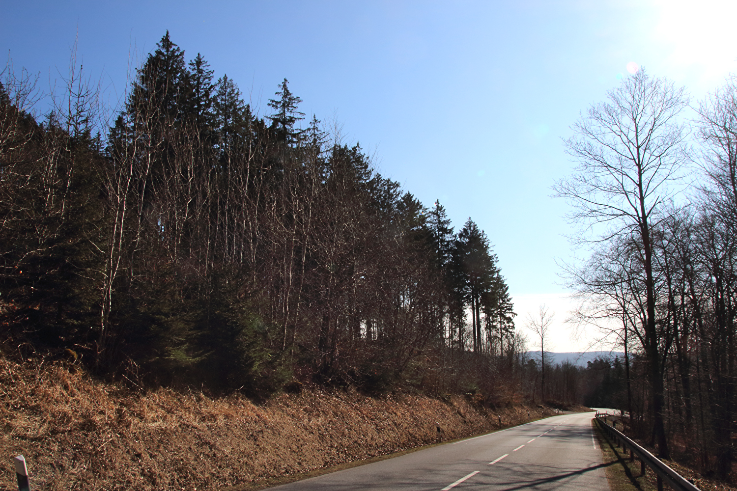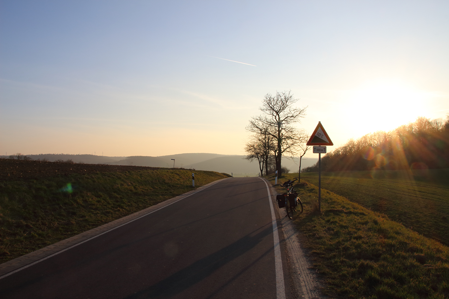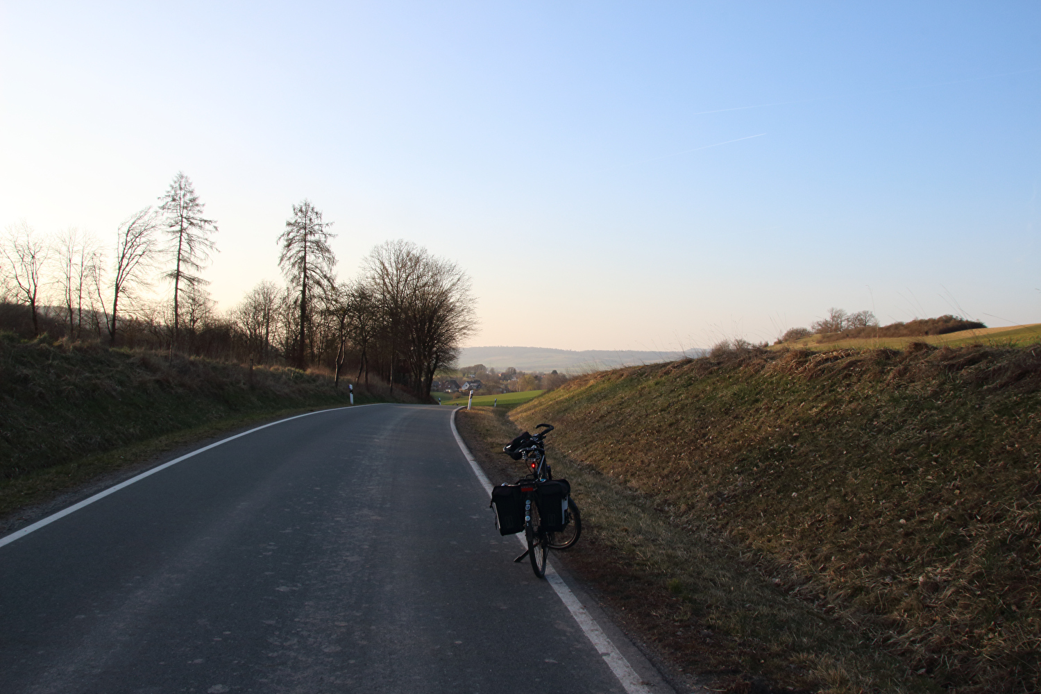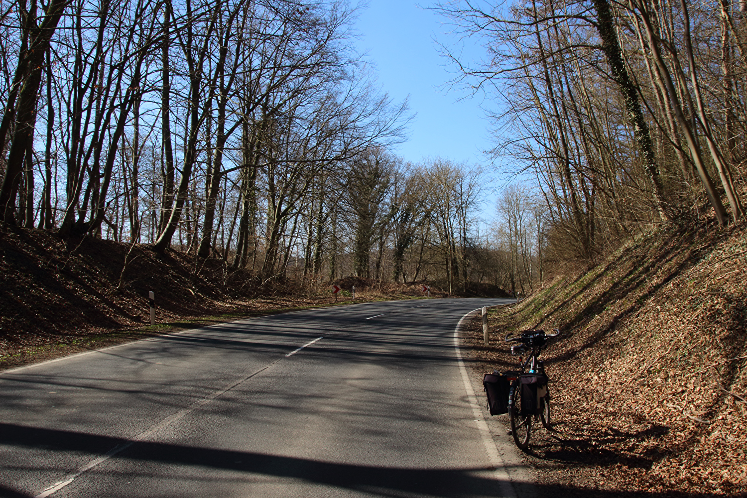 Das sonnige und auch einigermaßen warme Wetter erlaubten in Kombination mit der schon recht langen Tageslänge einen Tag nach der Frühjahrstagundnachtgleiche (20.03.2025 10:01 MEZ) eine erste lange Tour in diesem Jahr. Die Tageswärme setzte sich auch in den Wäldern durch, da die Laubbäume und Sträucher noch unbelaubt waren und somit das einfallende Sonnenlicht weitgehend bis zum Boden vordringen konnte. Bei der Einfahrt nach Grünenplan wurde die Hauptstraße kurzzeitig verlassen und zunächst durch ein Wohgebiet gefahren. Auf dem Weg zum Roten Fuchs stellte sich im Hinterrad ein Schleicher ein. Der abnehmende Reifendruck reichte noch gerade so eben bis zur Passhöhe. Dort war dann aber ein Schlauchwechsel fällig. Mit der Miniluftpumpe ließ sich auch nicht der gewünschte Reifendruck wieder herstellen. Daher wurde die Abfahrt langsam angegangen und in Eschershausen an einer Tanke bis zum gewünschten Reifendruck aufgepumpt. Durch den Zeitverlust kam die Überlegung auf, die Tour ab Bodenwerder auf dem Weserradweg abzukürzen. Diese Überlegung wurde aber mit Erreichen des Wesertals wieder verworfen und die Tour wie ursprünglich geplant zu Ende gefahren. Dadurch erfolgte der Sonnenuntergang noch vor dem Tourziel im flachen Auslauf der Tour nördlich von Grohnde. Kurz vor Sonnenuntergang wurde es merklich kälter, weshalb die Tour in langen Klamotten endete.