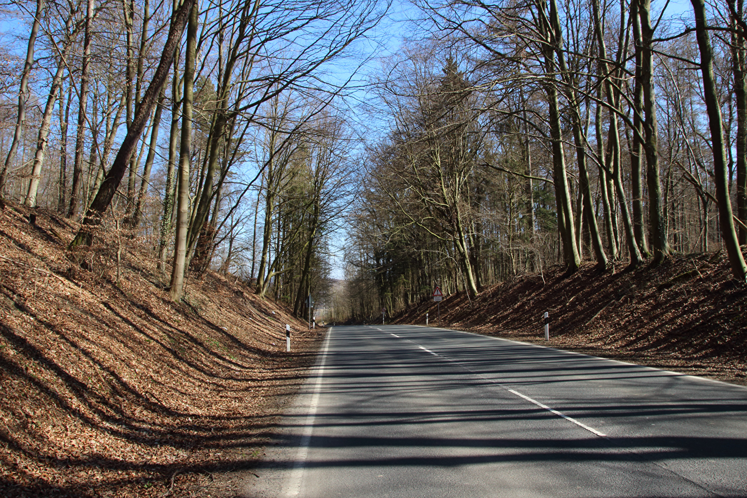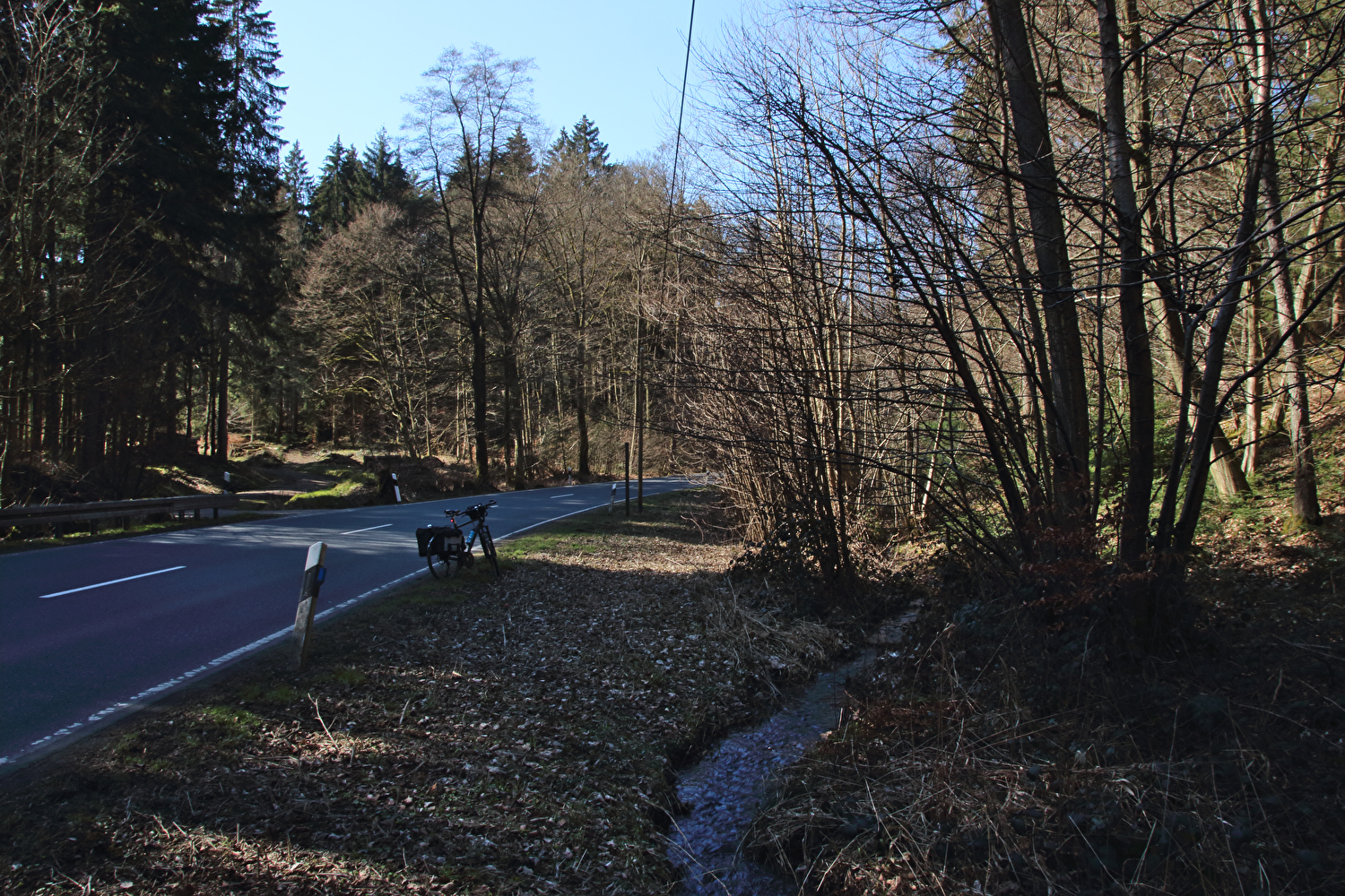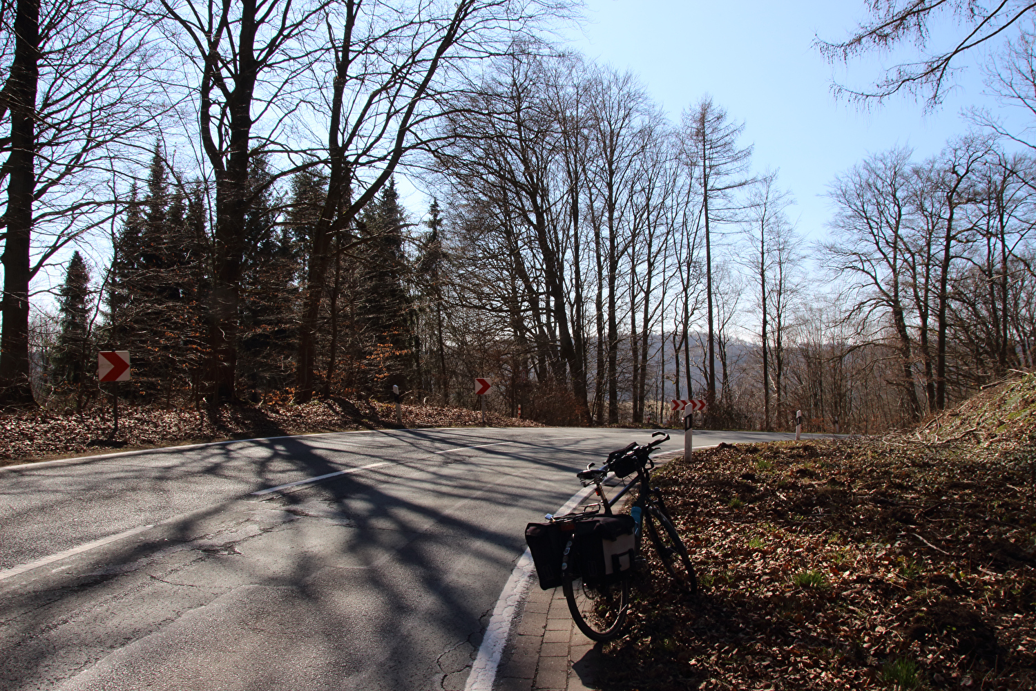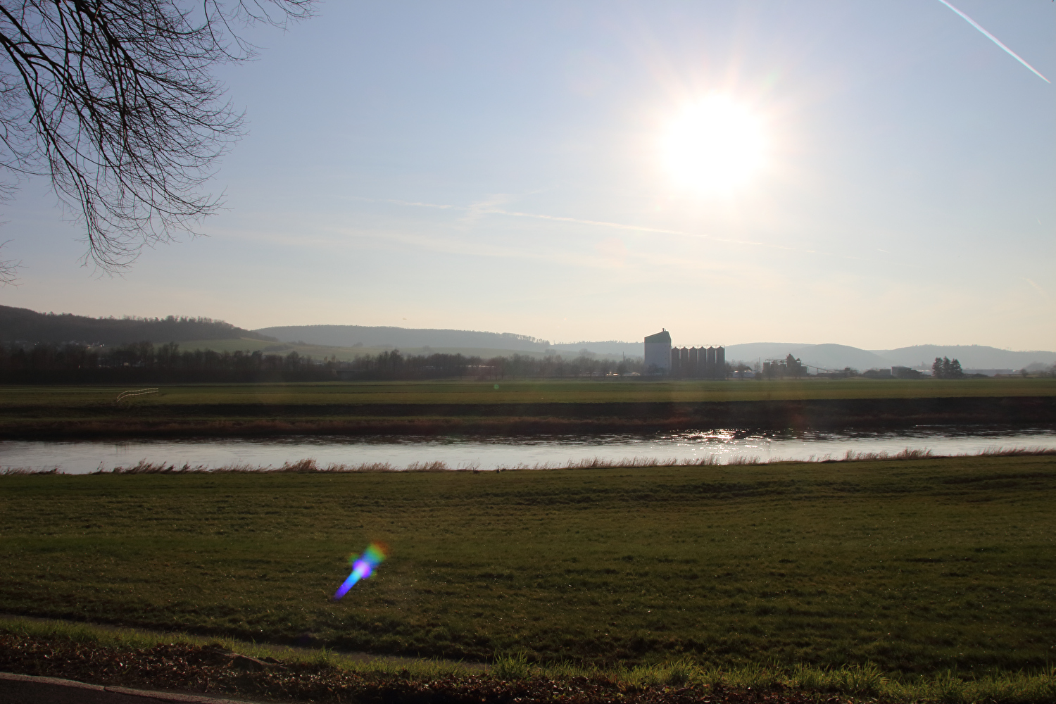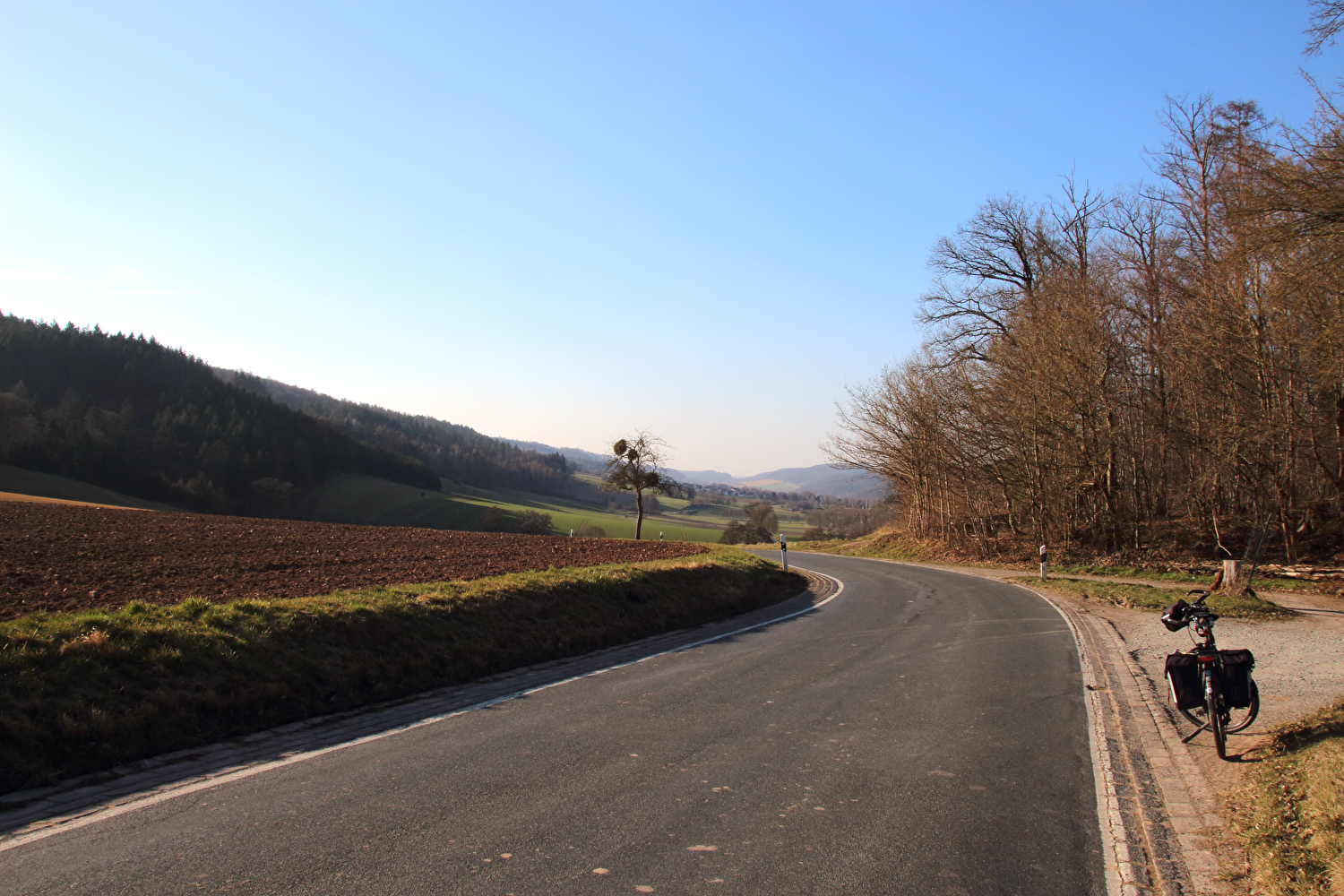 Das sonnige und auch einigermaßen warme Wetter erlaubten in Kombination mit der schon recht langen Tageslänge einen Tag nach der Frühjahrstagundnachtgleiche (20.03.2025 10:01 MEZ) eine erste lange Tour in diesem Jahr. Die Tageswärme setzte sich auch in den Wäldern durch, da die Laubbäume und Sträucher noch unbelaubt waren und somit das einfallende Sonnenlicht weitgehend bis zum Boden vordringen konnte. Bei der Einfahrt nach Grünenplan wurde die Hauptstraße kurzzeitig verlassen und zunächst durch ein Wohgebiet gefahren. Auf dem Weg zum Roten Fuchs stellte sich im Hinterrad ein Schleicher ein. Der abnehmende Reifendruck reichte noch gerade so eben bis zur Passhöhe. Dort war dann aber ein Schlauchwechsel fällig. Mit der Miniluftpumpe ließ sich auch nicht der gewünschte Reifendruck wieder herstellen. Daher wurde die Abfahrt langsam angegangen und in Eschershausen an einer Tanke bis zum gewünschten Reifendruck aufgepumpt. Durch den Zeitverlust kam die Überlegung auf, die Tour ab Bodenwerder auf dem Weserradweg abzukürzen. Diese Überlegung wurde aber mit Erreichen des Wesertals wieder verworfen und die Tour wie ursprünglich geplant zu Ende gefahren. Dadurch erfolgte der Sonnenuntergang noch vor dem Tourziel im flachen Auslauf der Tour nördlich von Grohnde. Kurz vor Sonnenuntergang wurde es merklich kälter, weshalb die Tour in langen Klamotten endete.