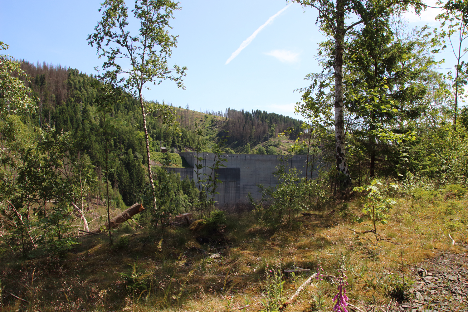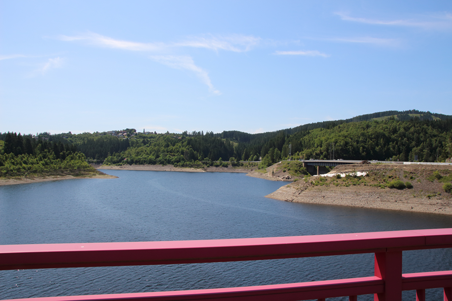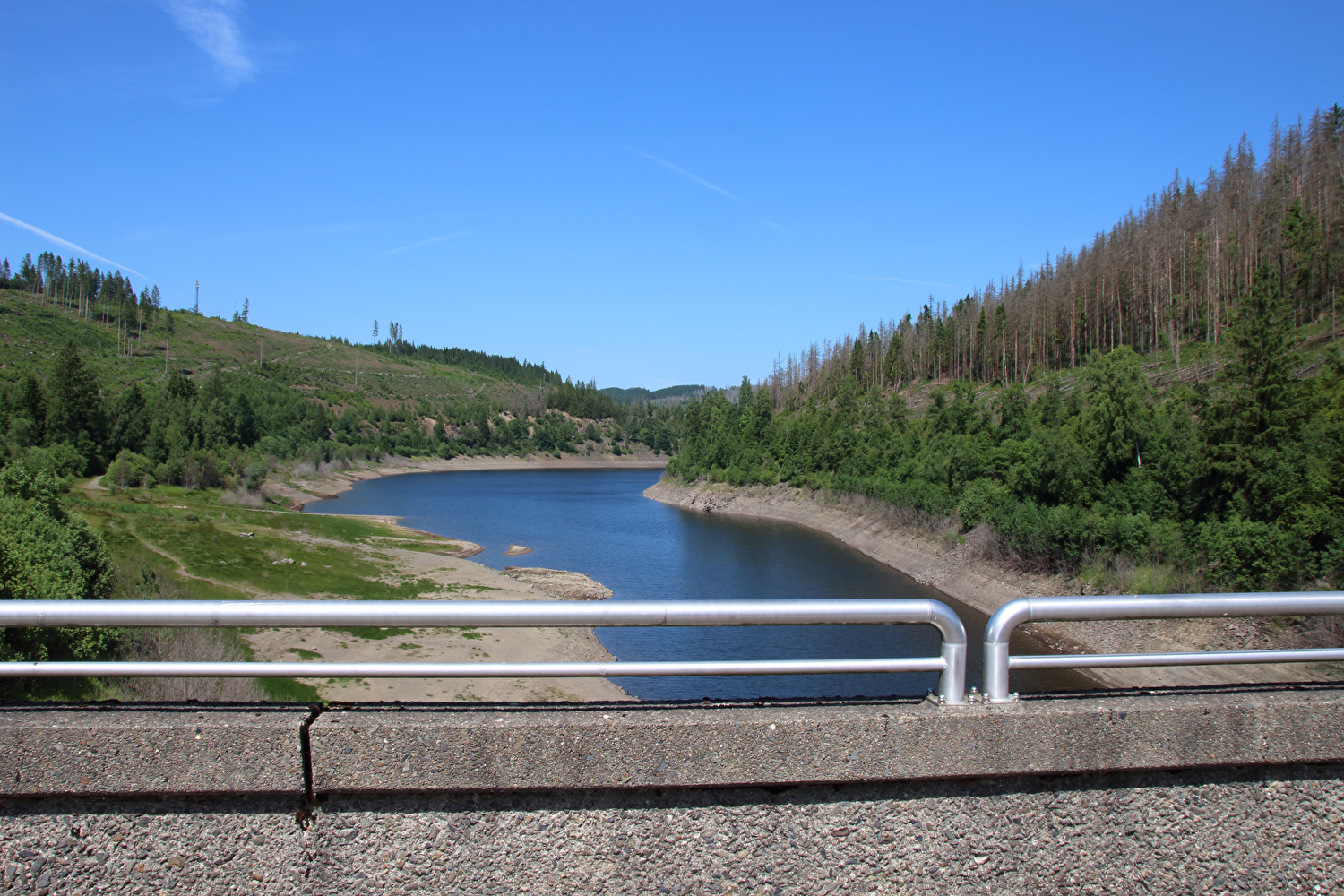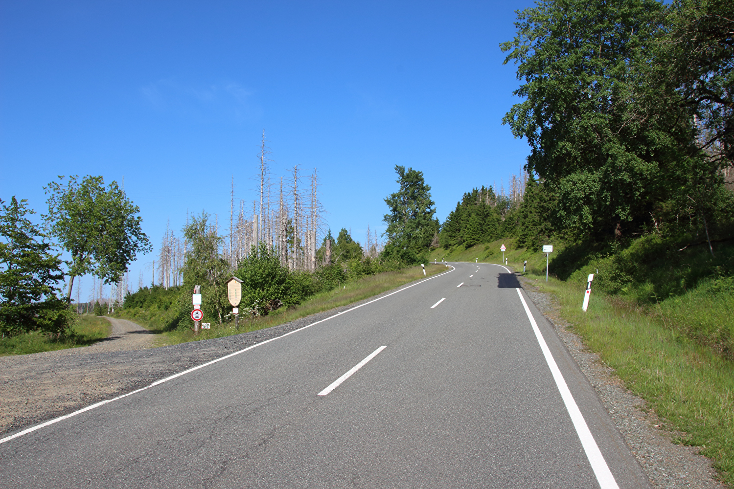 Fahrradfahren im Harz bedeutet seit geraumer Zeit Fahrradfahren ohne Wald. ☹ Deshalb wurde im Jahr zuvor auch komplett darauf verzichtet. Allerdings bietet nur der Harz in Norddeutschland längere Anstiege. Somit stand bei dieser Tour die Fahrt bergauf im Vordergrund. Die Okertalsperre war für die Jahreszeit sehr leer. Ab Altenau verlief die Tour bis Torfhaus fast durchgängig in der prallen Sonne. Lagen früher weite Teile der L504 die meiste Zeit des Tages im Schatten, kam dieser nur noch vereinzelt von wenigen übrig gebliebenen Bäumen. Als Fluchtort vor sommerlicher Hitze scheidet der großflächig entwaldete Harz für längere Zeit aus, da seine Höhe allein dafür nicht ausreicht.