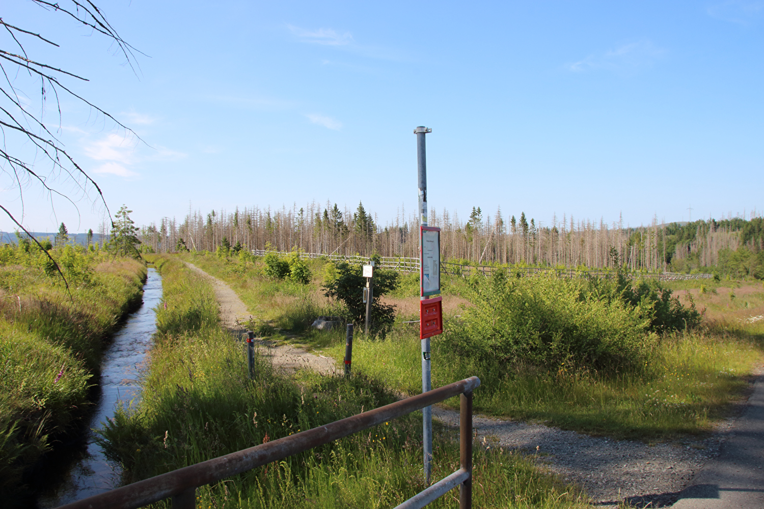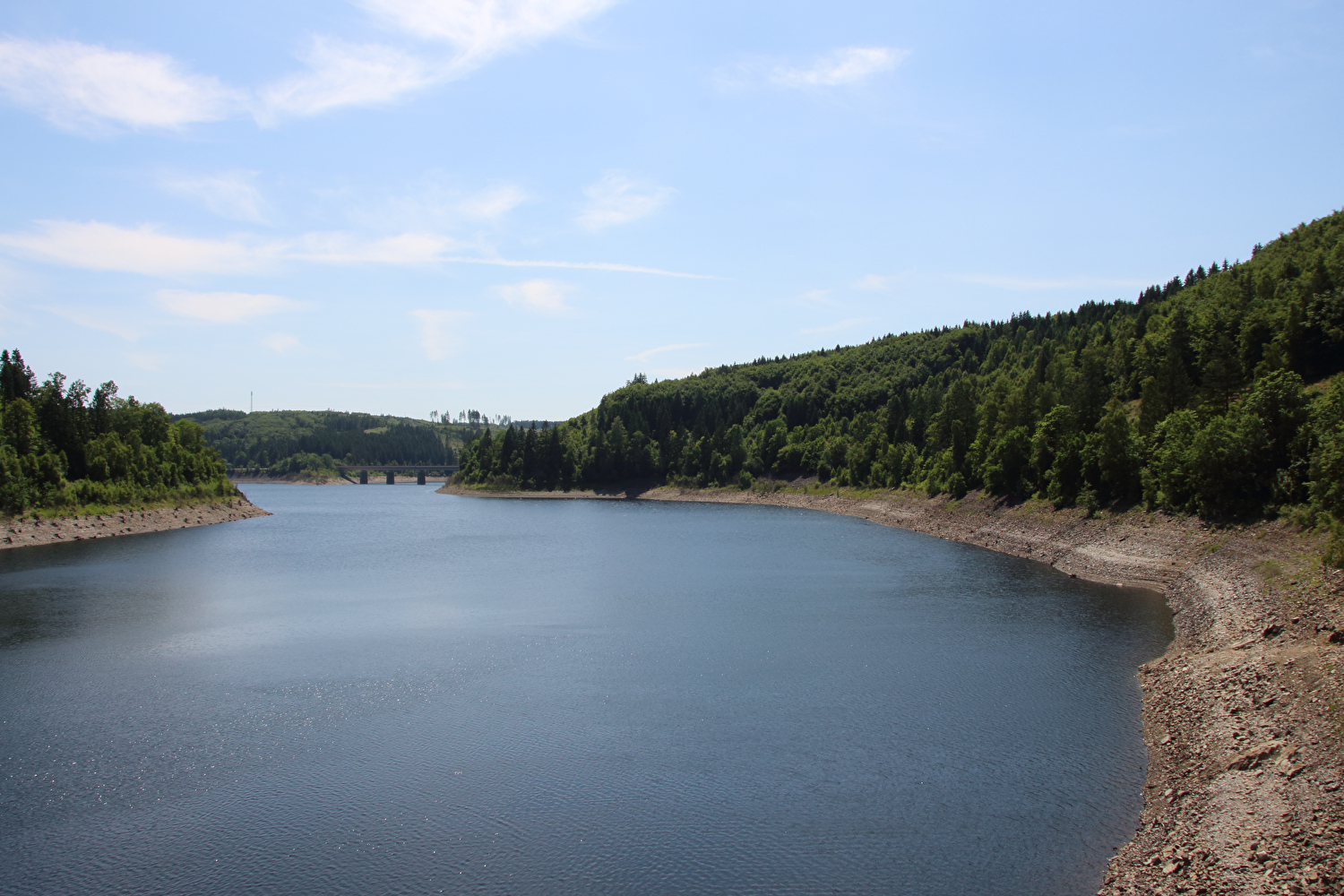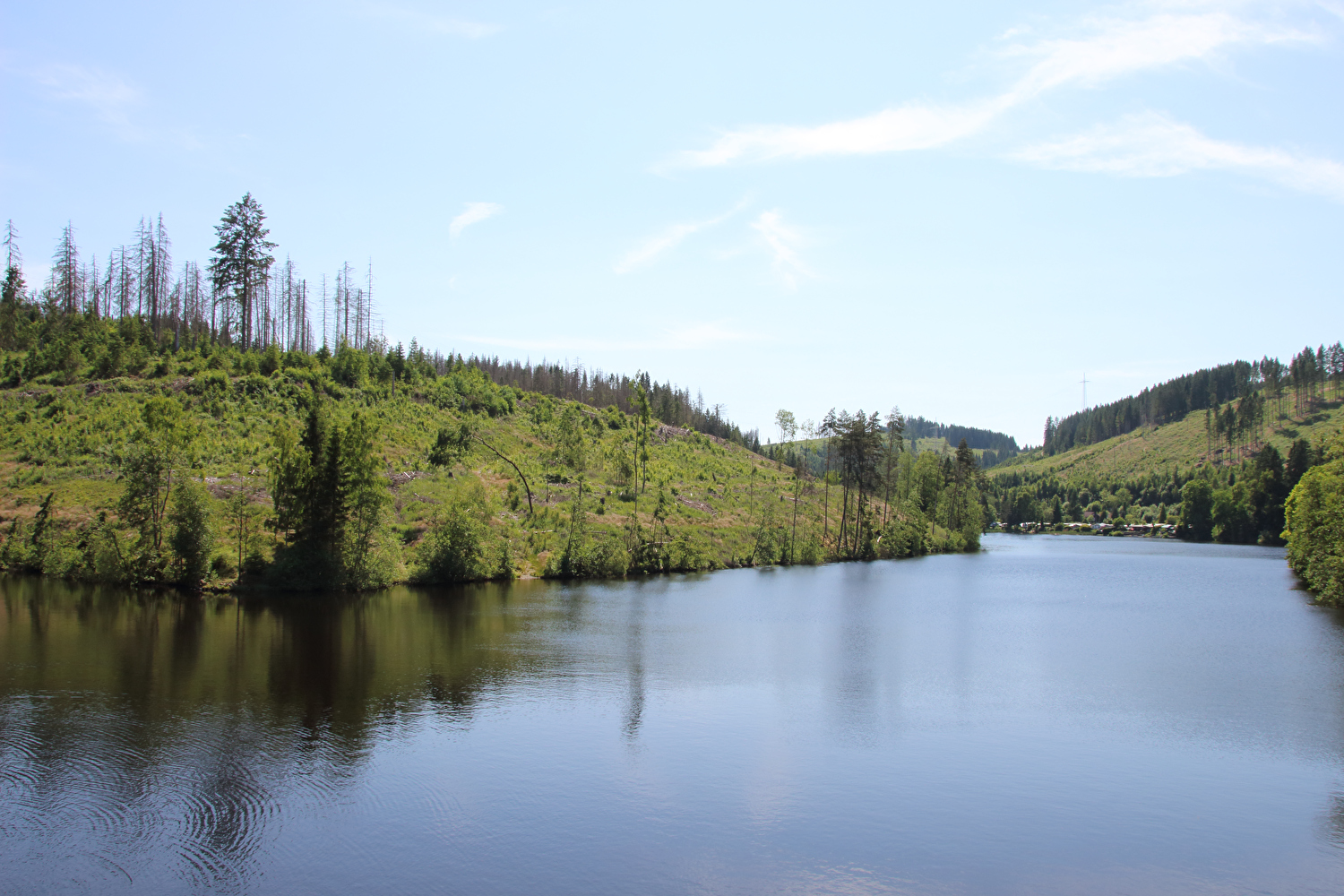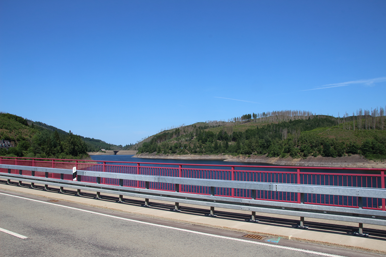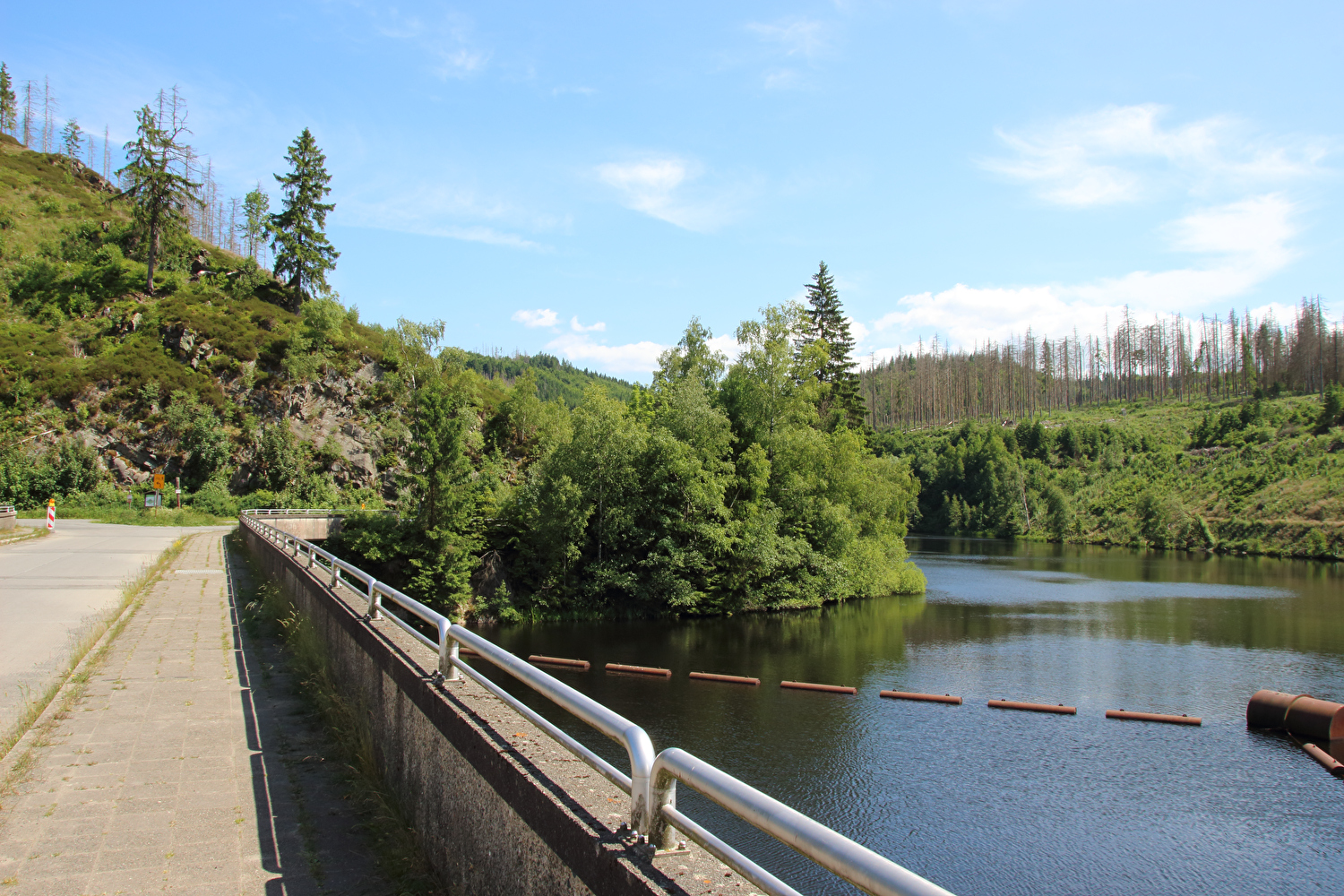 Fahrradfahren im Harz bedeutet seit geraumer Zeit Fahrradfahren ohne Wald. ☹ Deshalb wurde im Jahr zuvor auch komplett darauf verzichtet. Allerdings bietet nur der Harz in Norddeutschland längere Anstiege. Somit stand bei dieser Tour die Fahrt bergauf im Vordergrund. Die Okertalsperre war für die Jahreszeit sehr leer. Ab Altenau verlief die Tour bis Torfhaus fast durchgängig in der prallen Sonne. Lagen früher weite Teile der L504 die meiste Zeit des Tages im Schatten, kam dieser nur noch vereinzelt von wenigen übrig gebliebenen Bäumen. Als Fluchtort vor sommerlicher Hitze scheidet der großflächig entwaldete Harz für längere Zeit aus, da seine Höhe allein dafür nicht ausreicht.