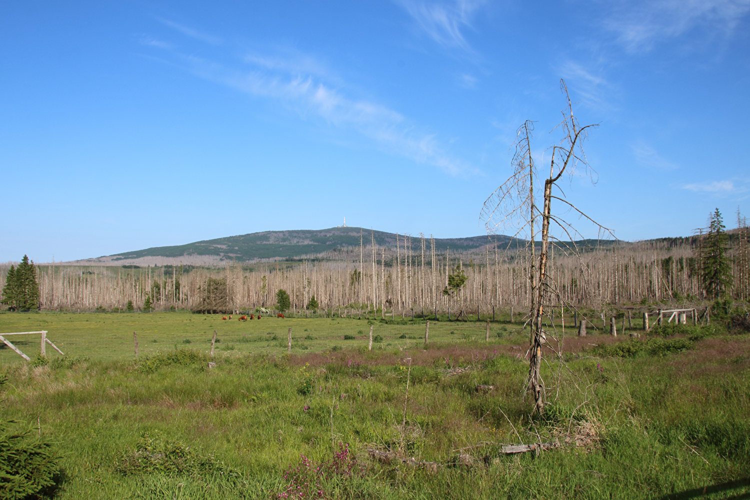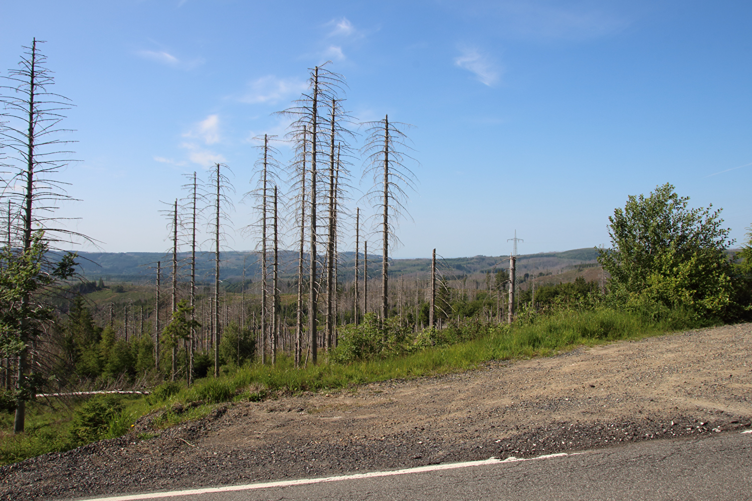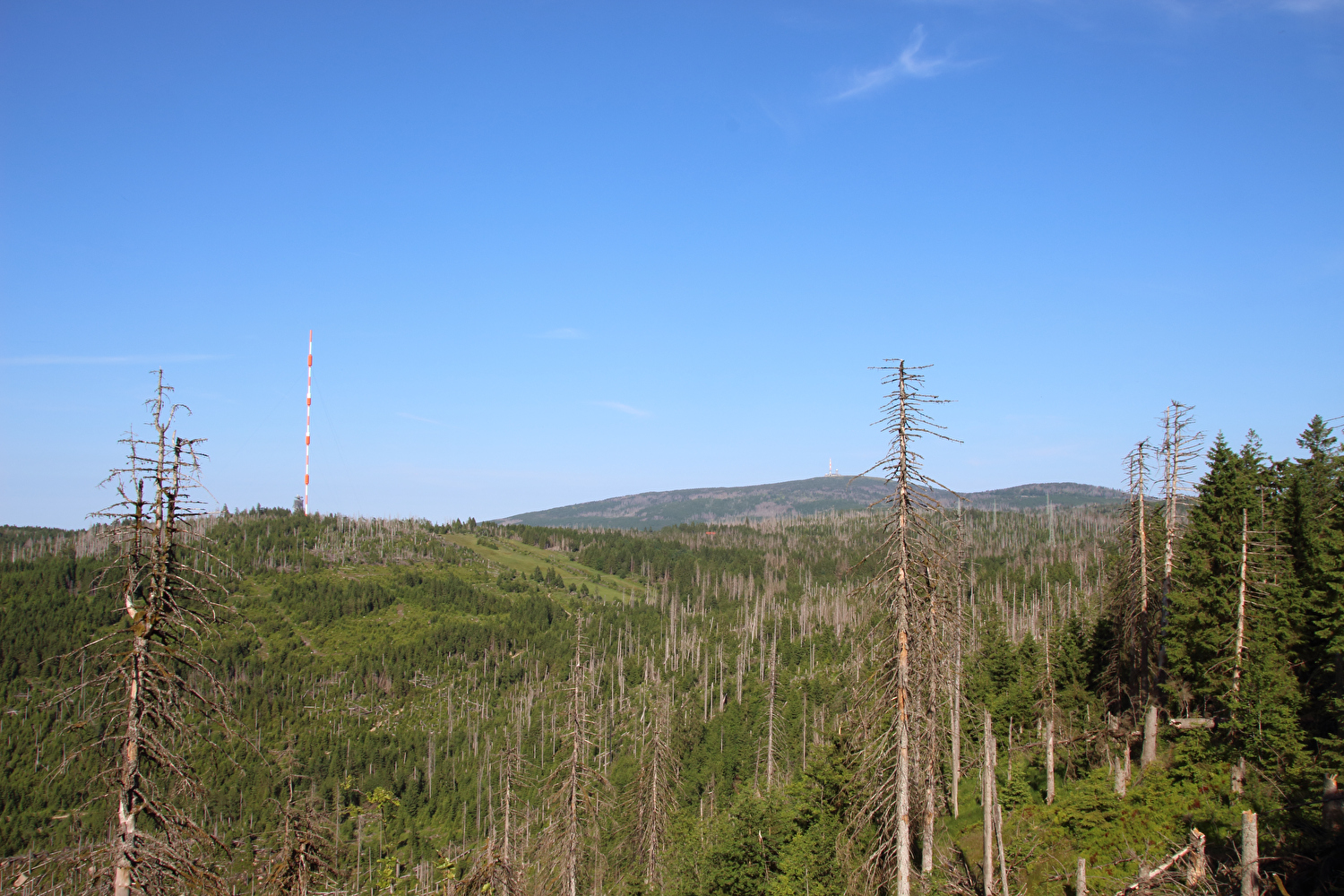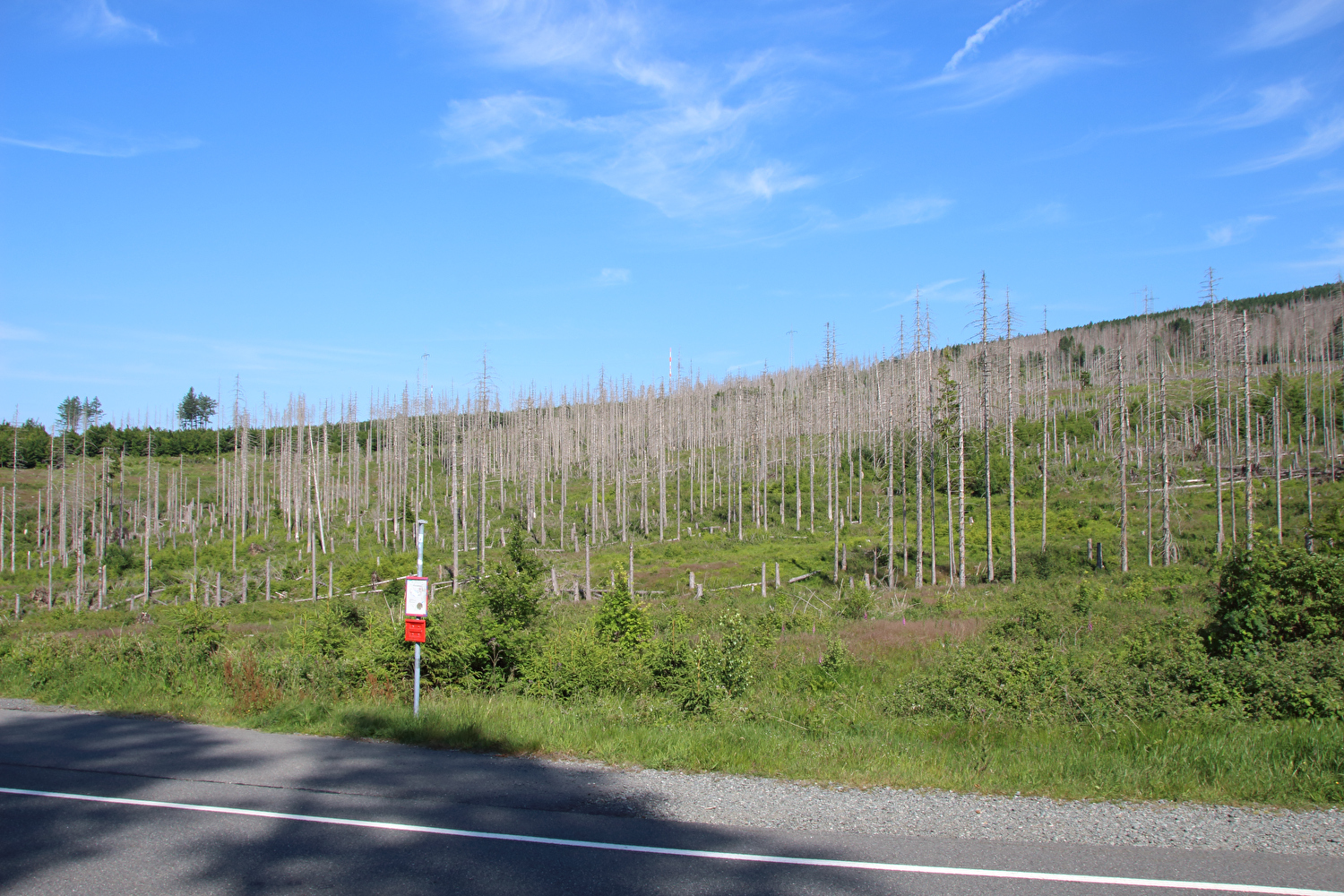 Fahrradfahren im Harz bedeutet seit geraumer Zeit Fahrradfahren ohne Wald. ☹ Deshalb wurde im Jahr zuvor auch komplett darauf verzichtet. Allerdings bietet nur der Harz in Norddeutschland längere Anstiege. Somit stand bei dieser Tour die Fahrt bergauf im Vordergrund. Die Okertalsperre war für die Jahreszeit sehr leer. Ab Altenau verlief die Tour bis Torfhaus fast durchgängig in der prallen Sonne. Lagen früher weite Teile der L504 die meiste Zeit des Tages im Schatten, kam dieser nur noch vereinzelt von wenigen übrig gebliebenen Bäumen. Als Fluchtort vor sommerlicher Hitze scheidet der großflächig entwaldete Harz für längere Zeit aus, da seine Höhe allein dafür nicht ausreicht.
