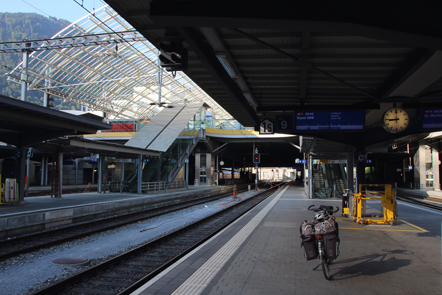 Da der Proviant für die Bahnrückreise bereits am Tag zuvor gekauft werden konnte und das Quartier in Bahnhofsnähe lag, passierte an diesem Tag auf dem Fahrrad fast nichts mehr. Bei der Buchung der Bahnrückreise wurde darauf geachtet bis Basel SBB mit einem Schweizer Zug zu fahren und erst in Basel SBB in einen deutschen Zug umzusteigen. Diese Buchung war recht kompliziert, da die Bahn (DB) ohne besondere Maßnahmen immer einen Umstieg bereits in Zürich HB in einen deutschen ICE anbot. Im Vorfeld der Buchung war bereits bekannt gewesen, dass aus Deutschland kommende Züge, die fahrplanmäßig über Basel SBB in die Schweiz einfahren, in Basel SBB enden, wenn sie dort mit mehr als 15 min Verspätung eintreffen, da die Schweiz keine großen Verspätungen aus dem Ausland importieren möchte. Wenn ein aus Deutschland kommender Zug verspätungsbedingt zwangsweise schon in Basel SBB endet, fehlt dieser natürlich auch für die Rückfahrt auf der Strecke innerhalb der Schweiz bis Basel SBB. Genau das war passiert. Der gebuchte ICE, der eigentlich hätte in Zürich HB abfahren sollen, kam in Basel SBB nicht an. Der hatte aus Deutschland mit entsprechend großer Verspätung kommend in Basel SBB geendet und wurde dann dort für die Rückfahrt nach Deutschland bereit gestellt. Eine Rückreise mit dem von der Bahn vorgeschlagenen Umstieg in Zürich HB in den deutschen ICE wäre also sehr wahrscheinlich komplett schief gegangen, denn ob die Schweiz in solchen Fällen einen Ersatzzug bereit stellt, der den dann in Basel SBB stehenden ICE erreicht, ist nicht bekannt. Gebucht wurde zudem so, dass in Basel SBB genug Zeit blieb, um eine warme Mahlzeit zu kaufen. Durch diesen eingeplanten Zeitpuffer konnte ein von Chur nach Basel SSB durchgehender Zug gebucht werden. Viele Verbindungen zwischen Chur und Basel SBB sind mit Umstieg in Zürich. Das Risiko dort den Anschluss zu verpassen ist zwar gering, da die Züge in der Schweiz anders als in Deutschland größtenteils pünktlich verkehren, aber mit dem beladenen Fahrrad ist jeder Umstieg lästig. Zwischen Basel SBB und Hannover Hbf. sind durchgehende Verbindungen verfügbar, sodass weitere Umstiege vermieden werden können. Der ICE sammelte in Deutschland angekommen gleich erst mal baustellenbedingt 10 min Verspätung ein. Hannover Hbf. wurde dann aber doch mit nur 2 min Verspätung erreicht.